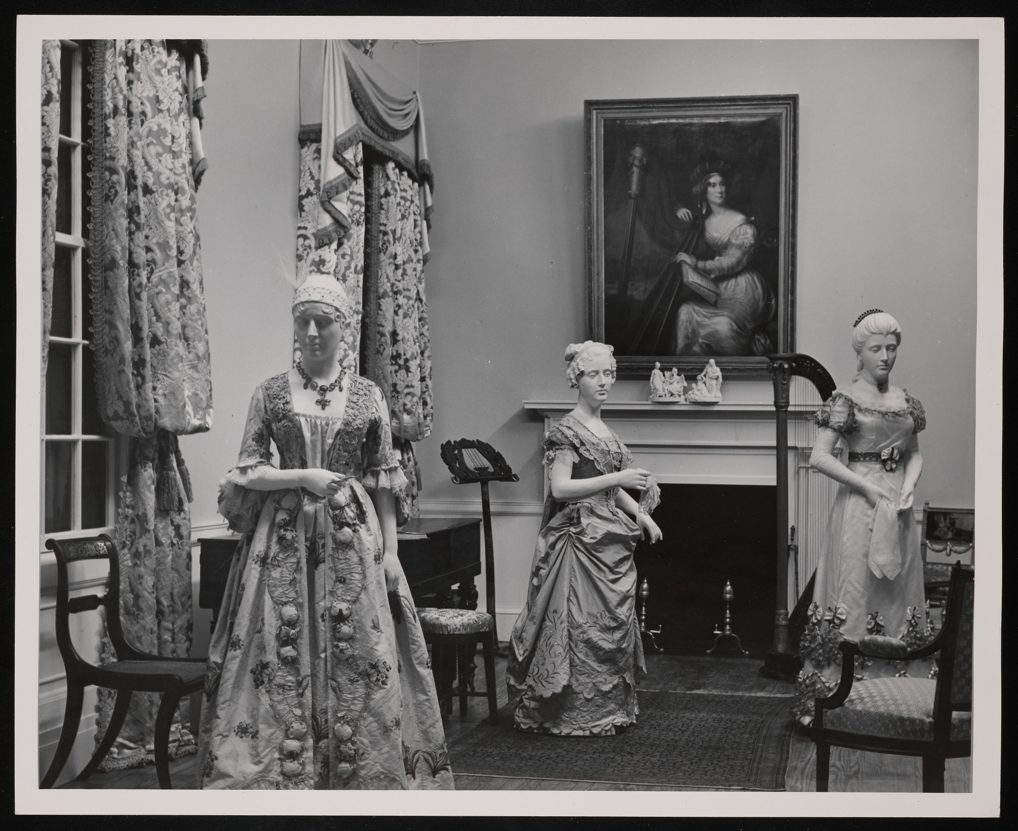 First Ladies Hall in the Arts and Industries Building, featuring dresses worn by Elizabeth Kortright Monroe, Maria Monroe Gouverneur, and Louisa Johnson Adams, with gowned figures placed in a likeness of the Music Room of the White House (1817-1829).