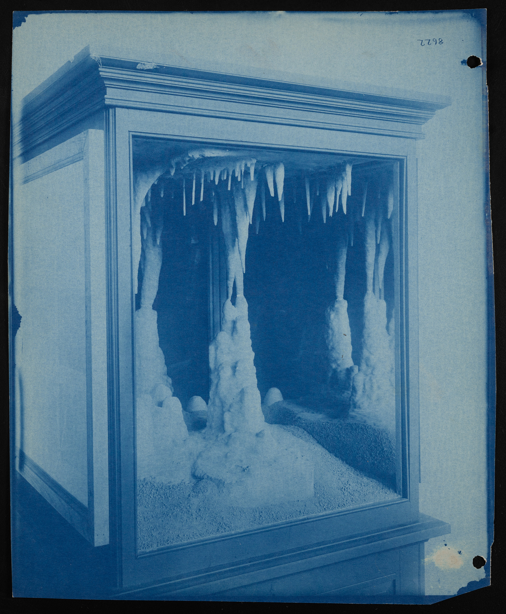Interior view, geology exhibit in the United States National Museum, now known as the Arts and Industries Building, featuring case of stalactites installed with mirror at back.
