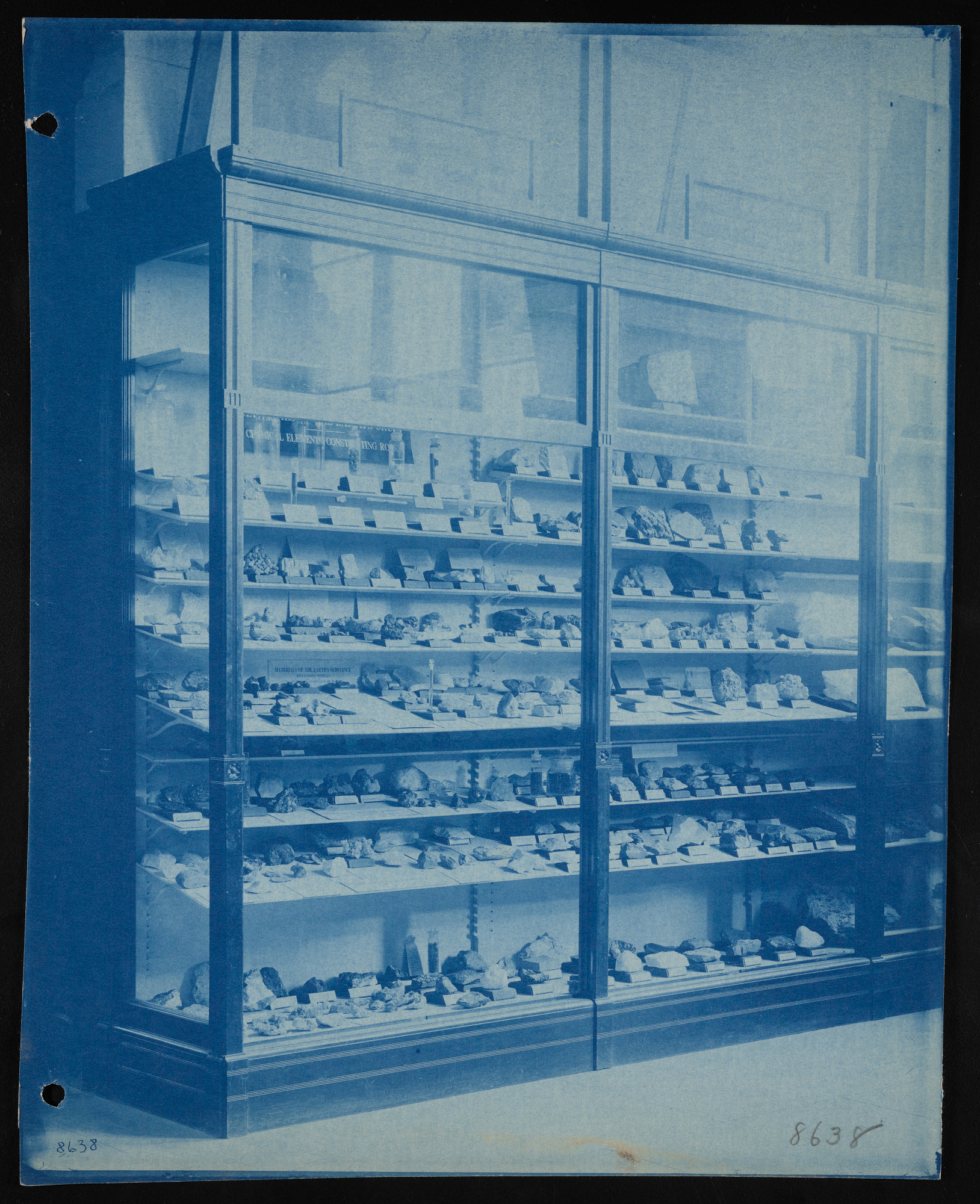 Interior view, geology exhibit in the United States National Museum, now known as the Arts and Industries Building, featuring geological specimens arranged in case on sloping shelves.