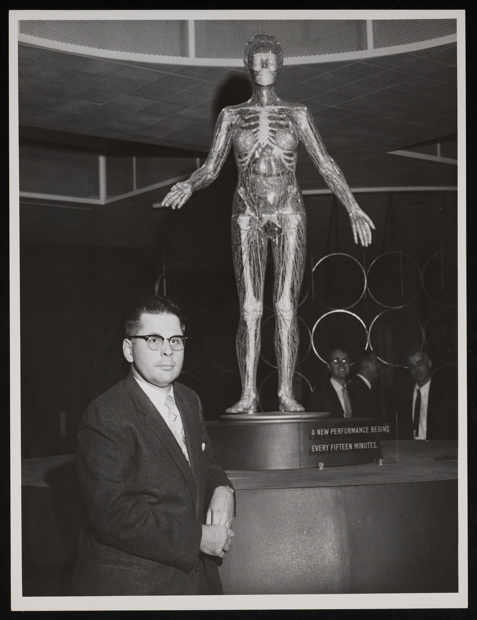 Hall of Health exhibit in the Arts and Industries Building, with George B. Griffenhagen, curator in the Division of Medical Sciences, standing next to the "Transparent Woman," a transparent manikin of a woman which shows by electronic devices, light, and sound, the location of the major organs of the human body and explains their functions.