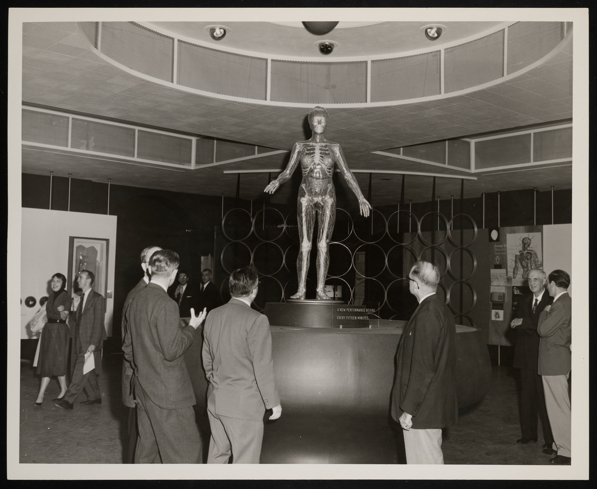 Interior view, Hall of Health exhibit in the Arts and Industries Building, with the "Transparent Woman," a transparent manikin of a woman which shows by electronic devices, light, and sound, the location of the major organs of the human body and explains their functions.