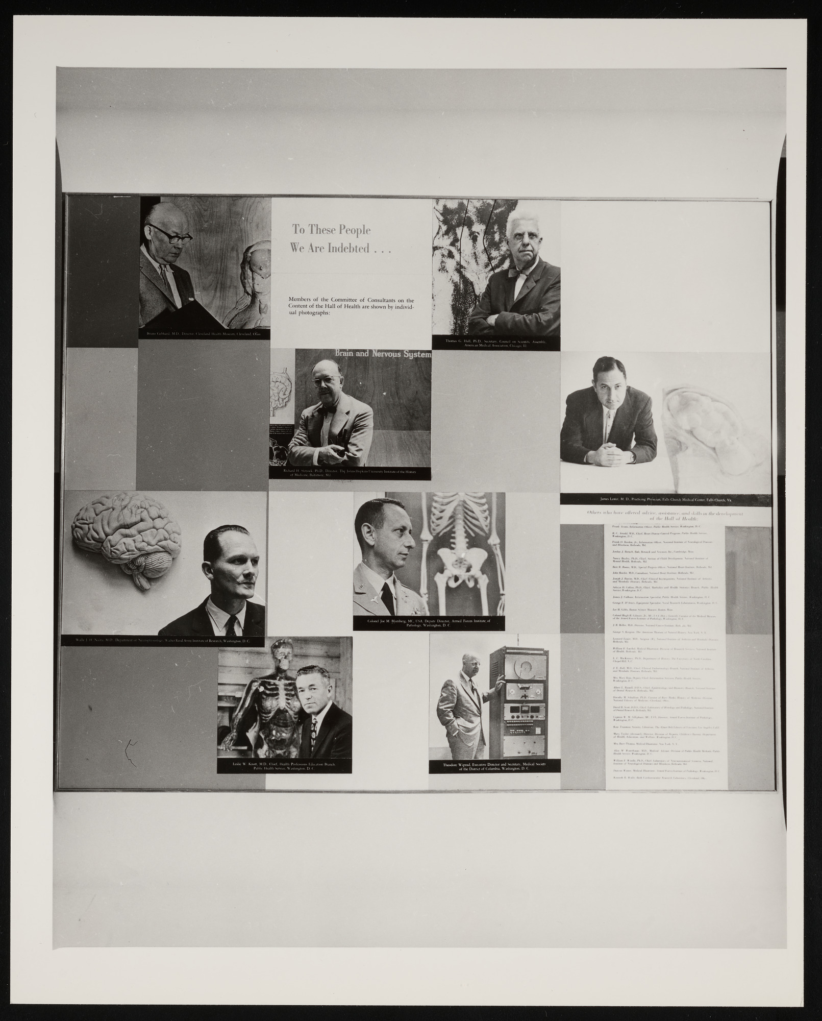 Exhibit panel in the Arts and Industries Building, featuring photographs of members of the Committee of Consultants on the Content of the Hall of Health.