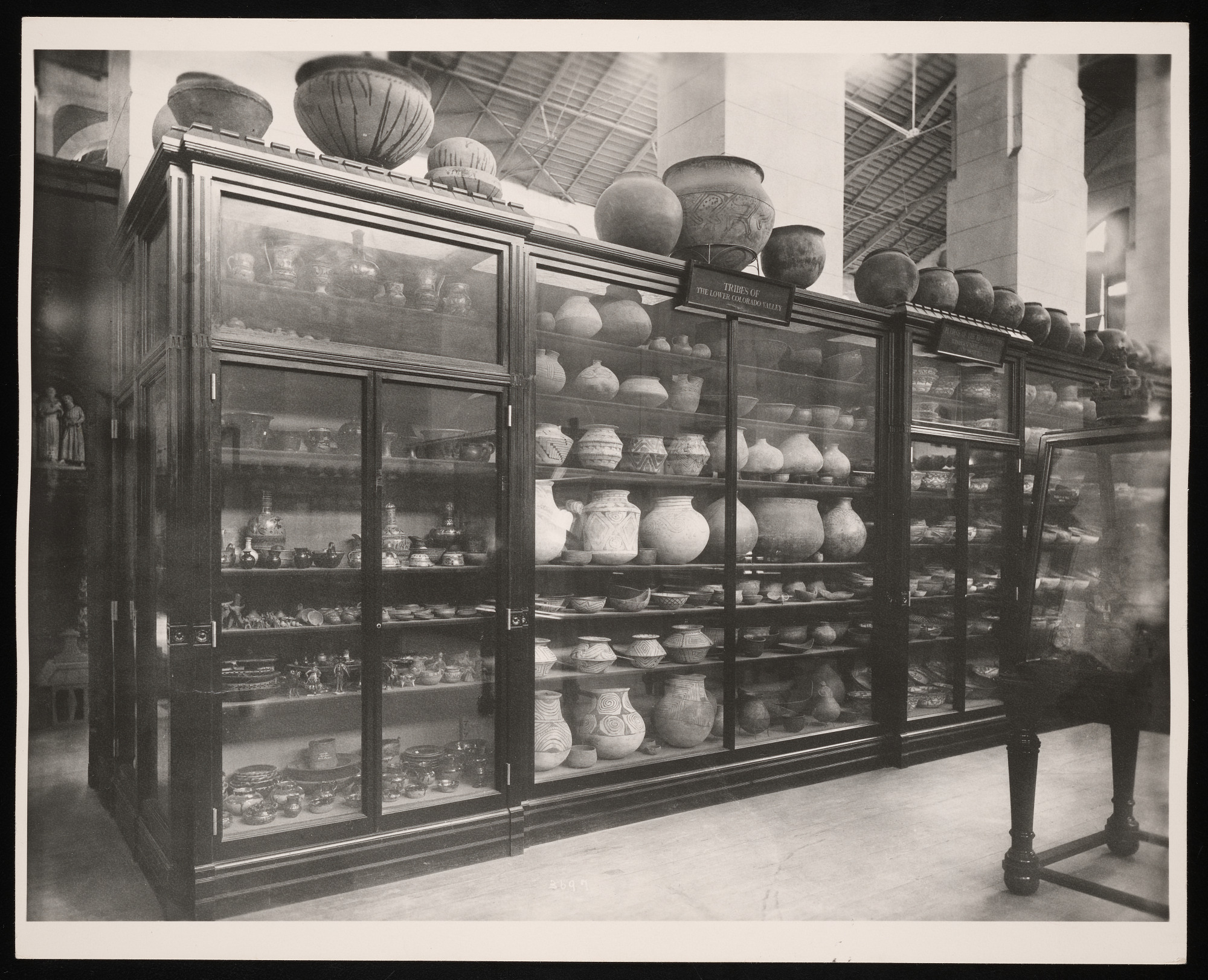 Interior view, anthropology exhibits in the United States National Museum, now known as the Arts and Industries Building, featuring "Tribes of the Lower Colorado Valley" pottery.