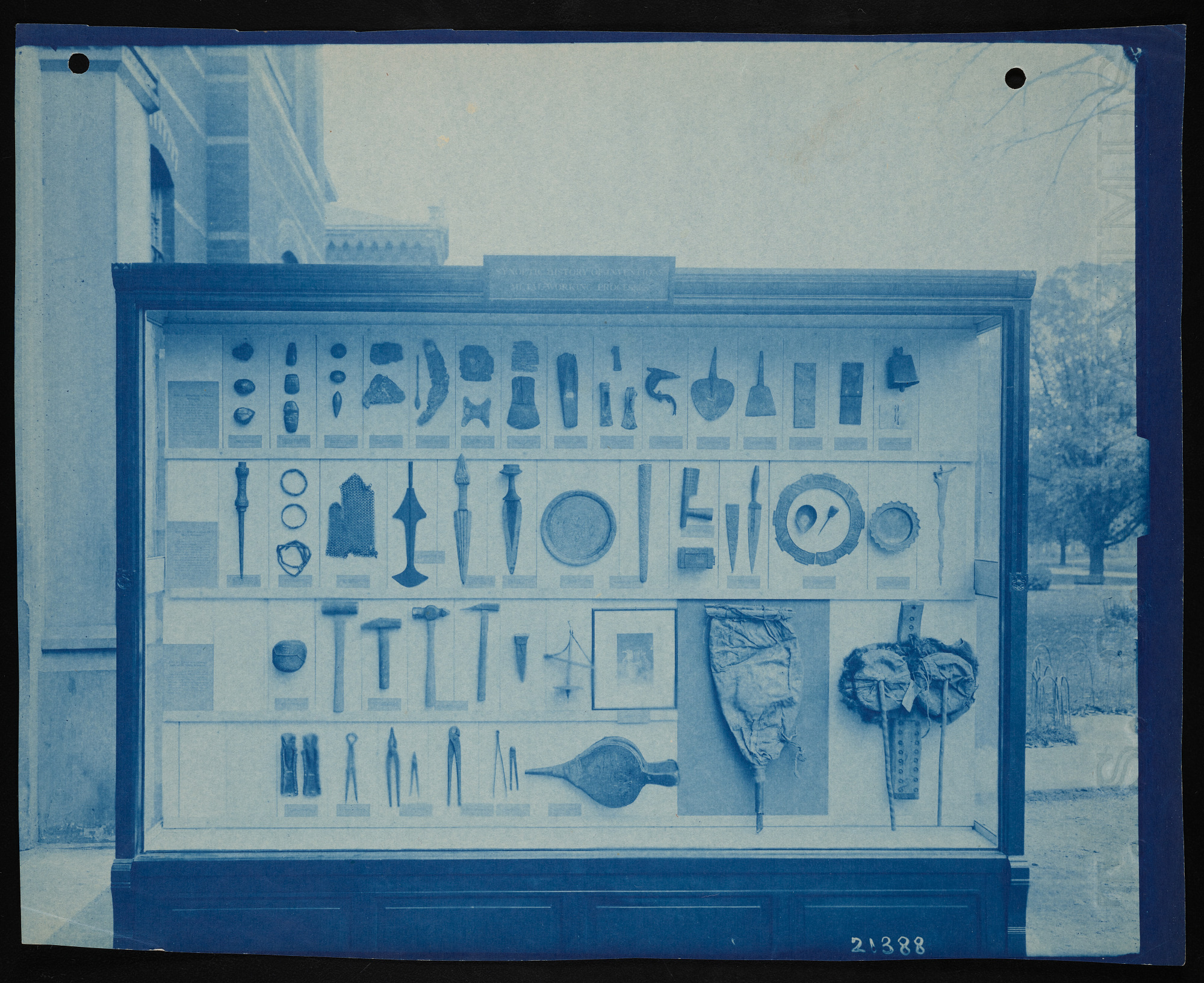 Interior view, exhibit case outside the United States National Museum, now known as the Arts and Industries Building, featuring "Synoptic History of Inventions: Metalworking Process."