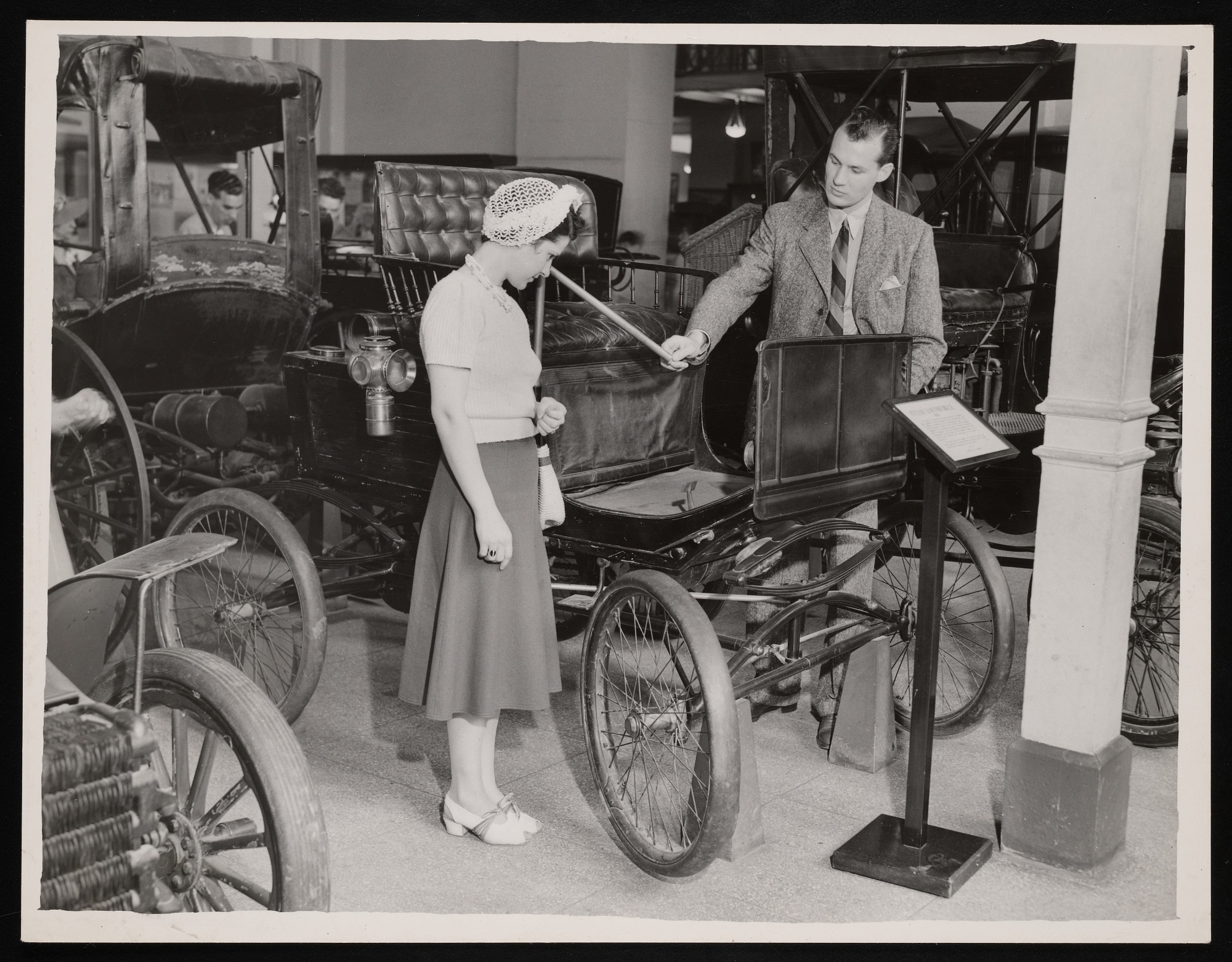 Interior view, transportation exhibits in the Arts and Industries Building, with museum visitors viewing steam automobile.