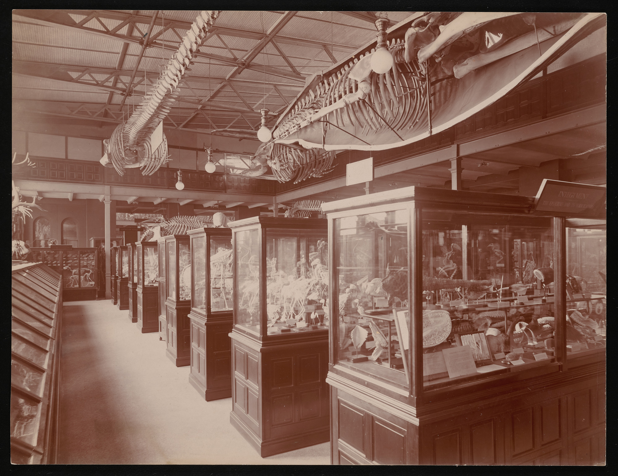 Interior view, comparative anatomy exhibits in the East South Range of the United States National Museum, now known as the Arts and Industries Building.