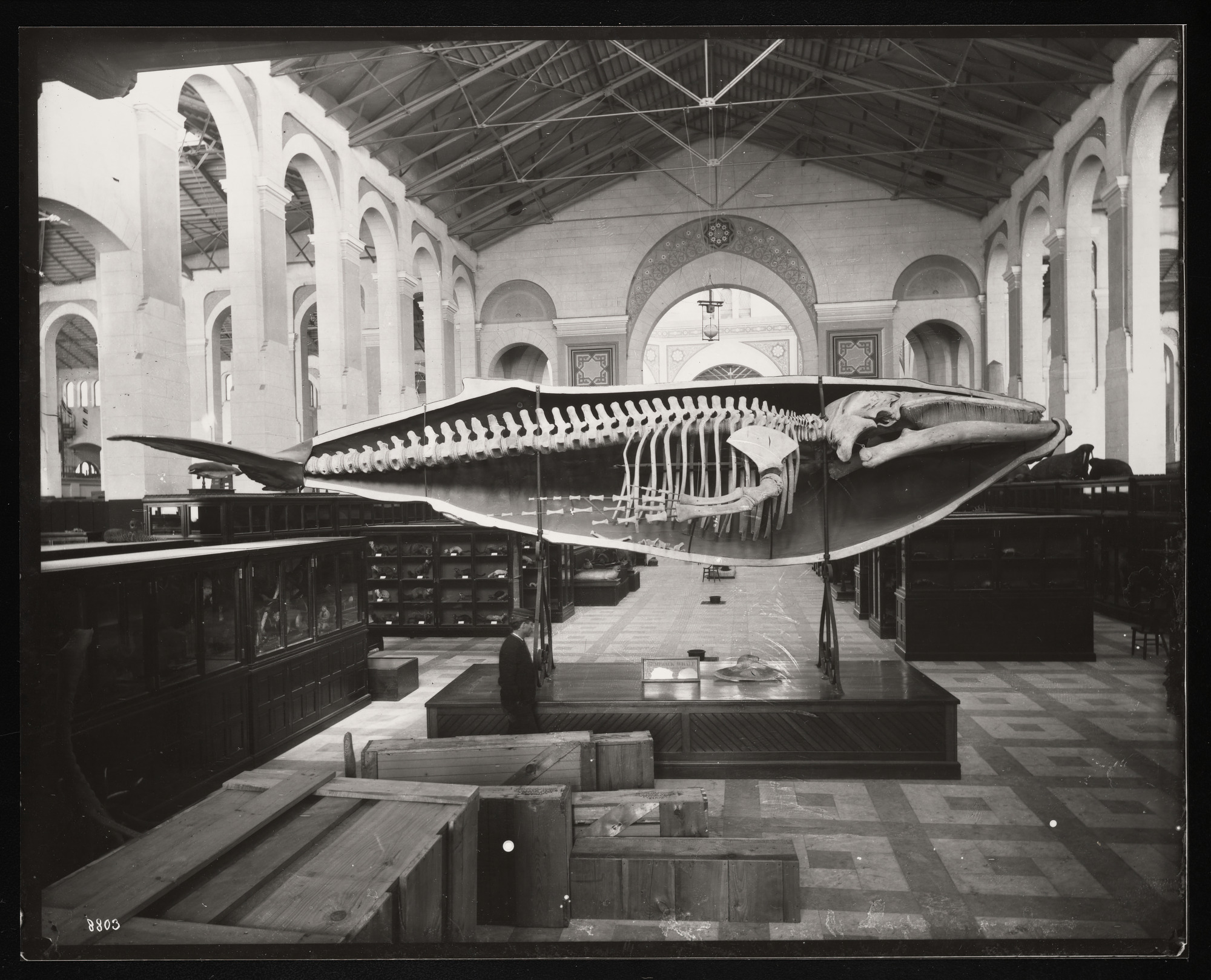 Interior view, mammals exhibits in the South Hall of the United States National Museum, now known as the Arts and Industries Building, with skeleton and cast of humpback whale in view.