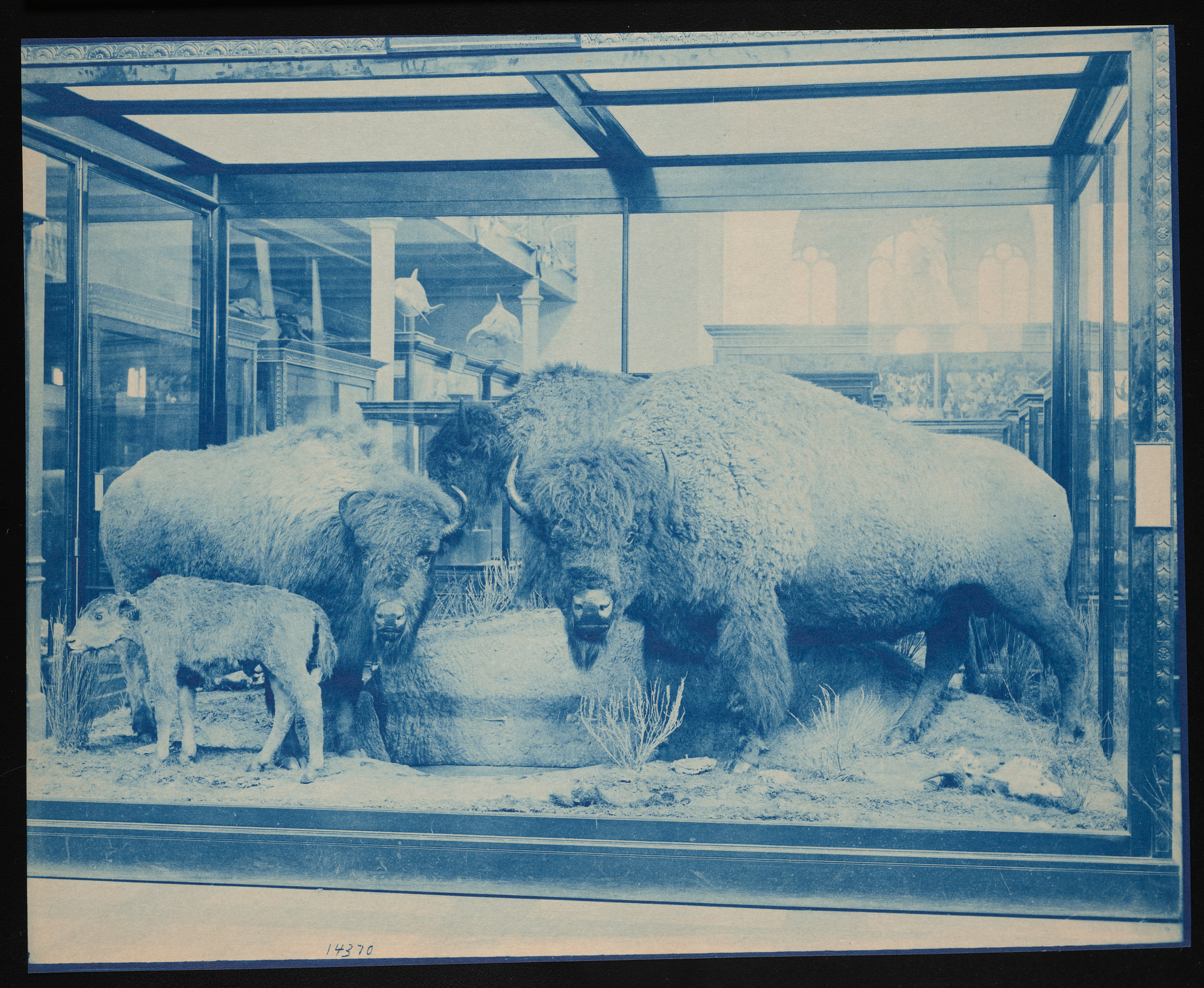 Mammals exhibit in the South Hall of the United States National Museum, now known as the Arts and Industries Building, featuring mounted specimens of "Group of Bisons or American Buffaloes, Bison Americanus (Gmelin), Collected and Mounted by by W.T. Hornaday, 1886-87."