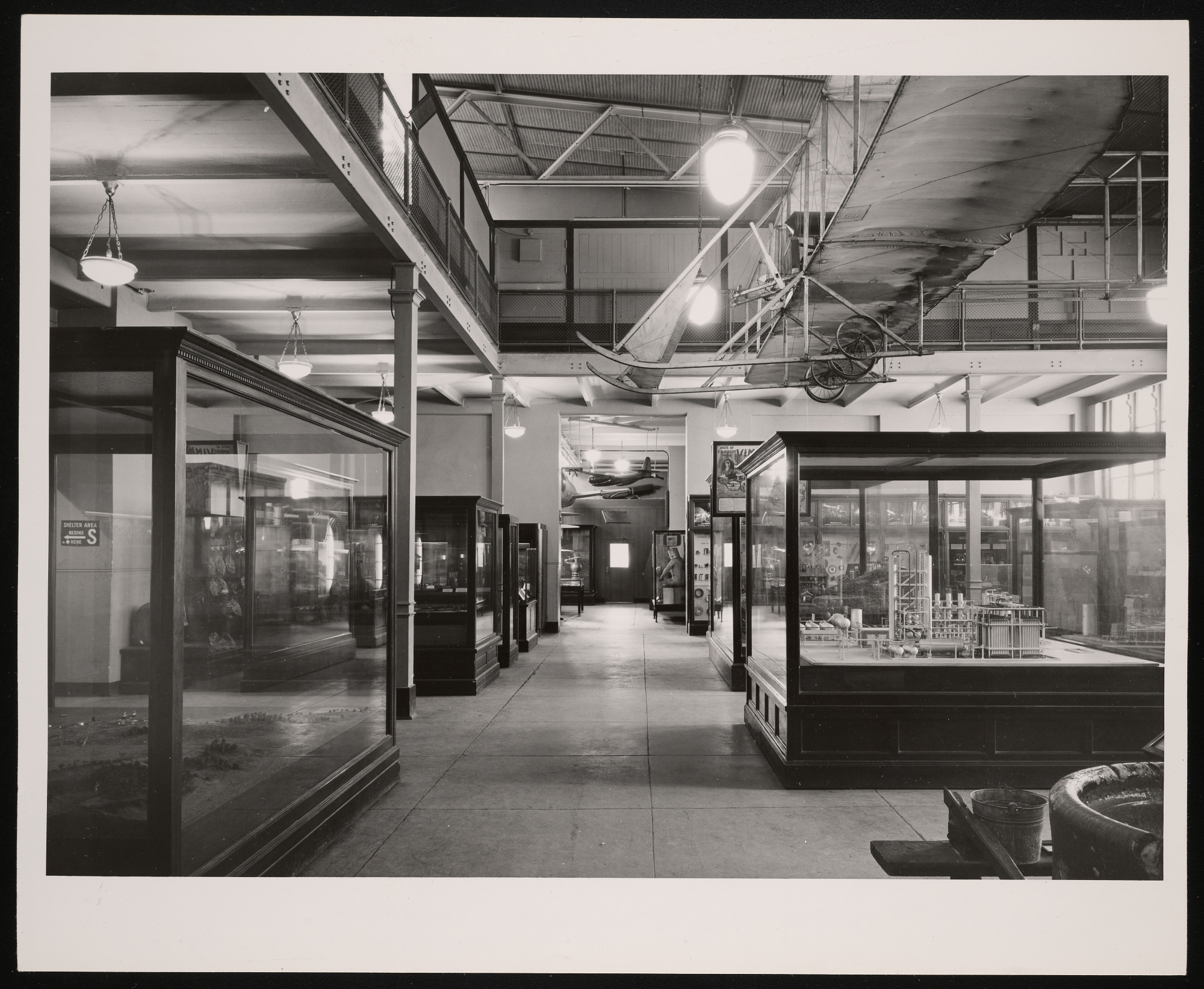 Interior view, mineral technology exhibits in the southwest range of the Arts and Industries Building, featuring industrial models, with aircraft in view.