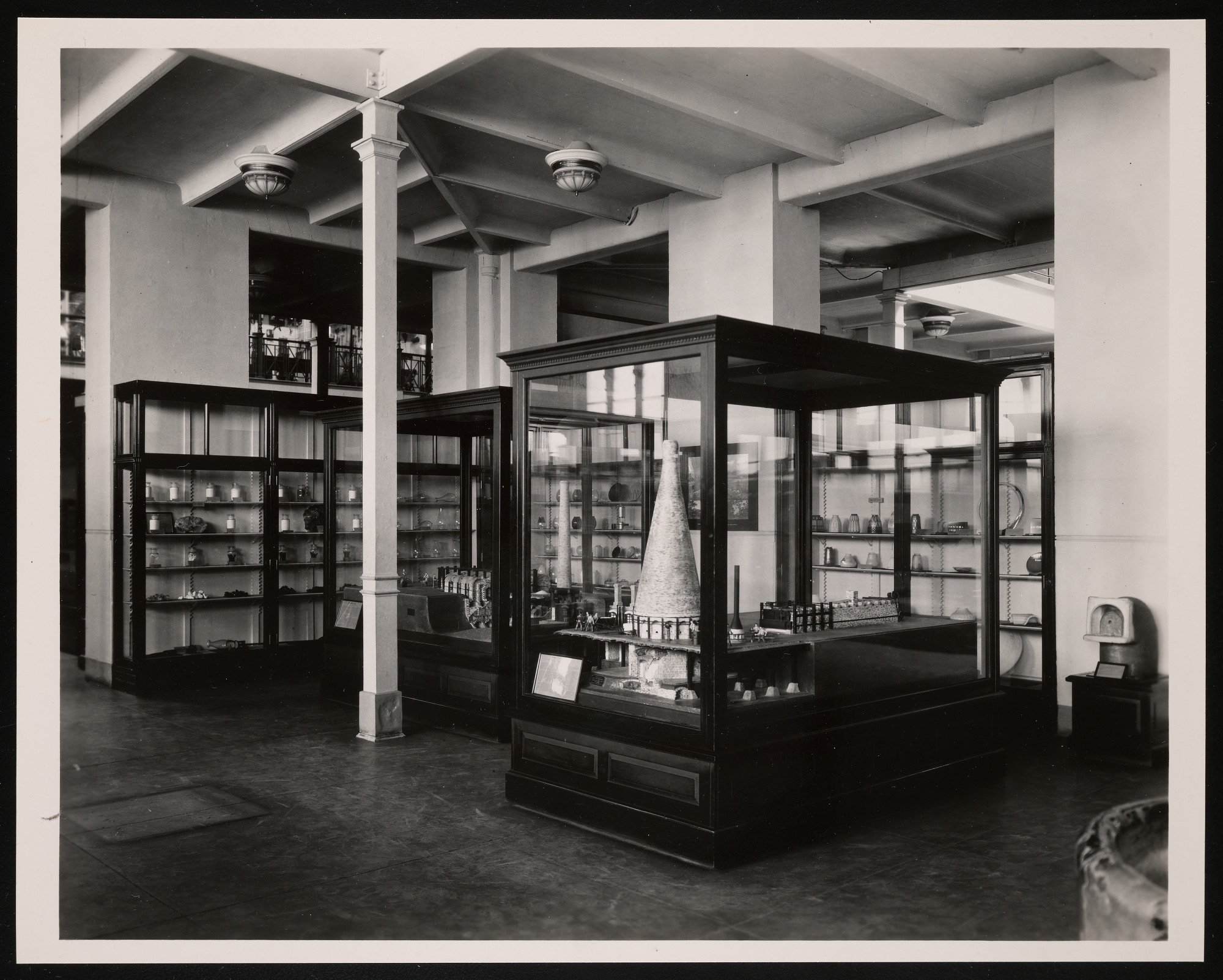 Interior view, mineral technology exhibits in the Arts and Industries Building, featuring industrial model of a regenerative glass heating furnace in the foreground and raw materials such as coal, limestone and sulphur as well as manufactured goods and by-products of minerals and fuels such as glass, abrasives, asphalt and gas in the surrounding cases.