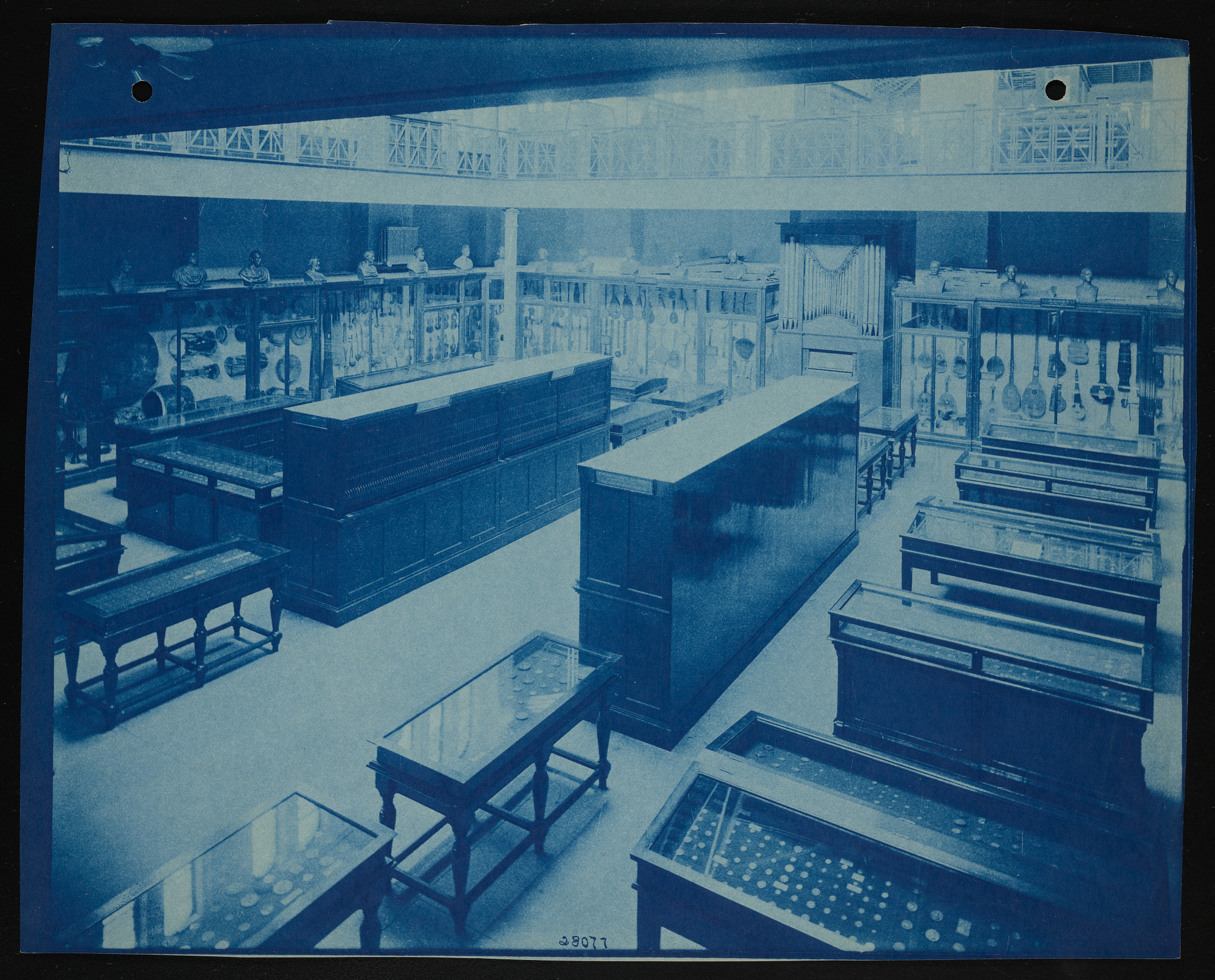 Interior view, exhibits in the Northwest Court of the Arts and Industries Building, featuring coins, medals, postage stamps, and musical instruments.