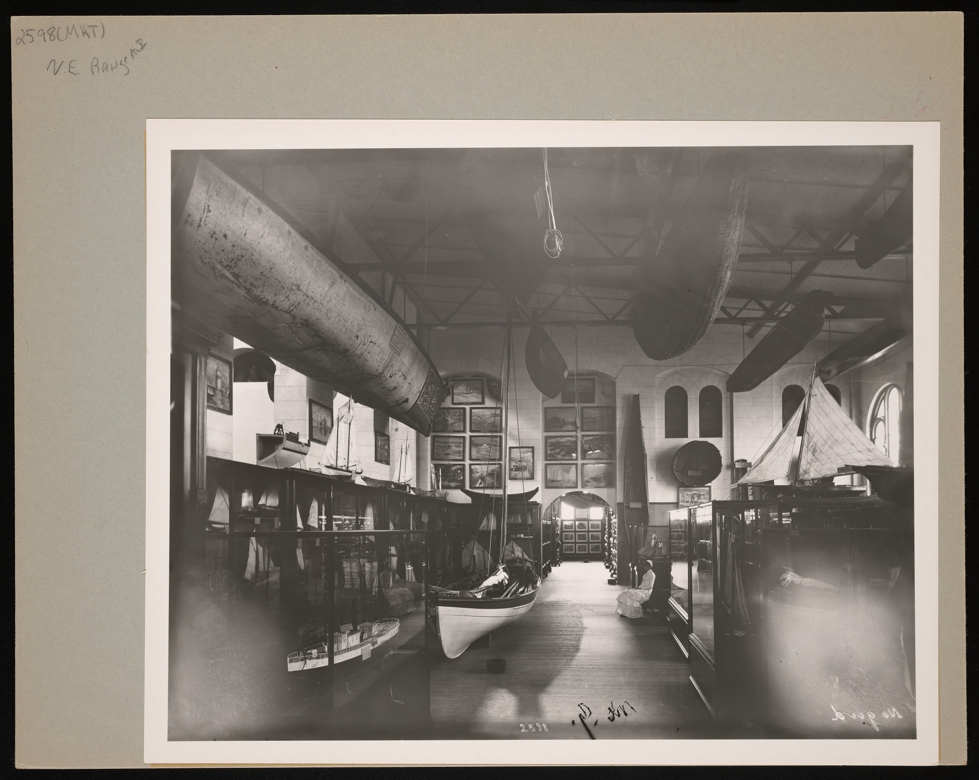 Interior view, Section of Naval Architecture exhibits, also known as Boat Hall, in the North East Range of the United States National Museum, now known as the Arts and Industries Building, featuring water craft of the world, boats, boat models, and ship models.