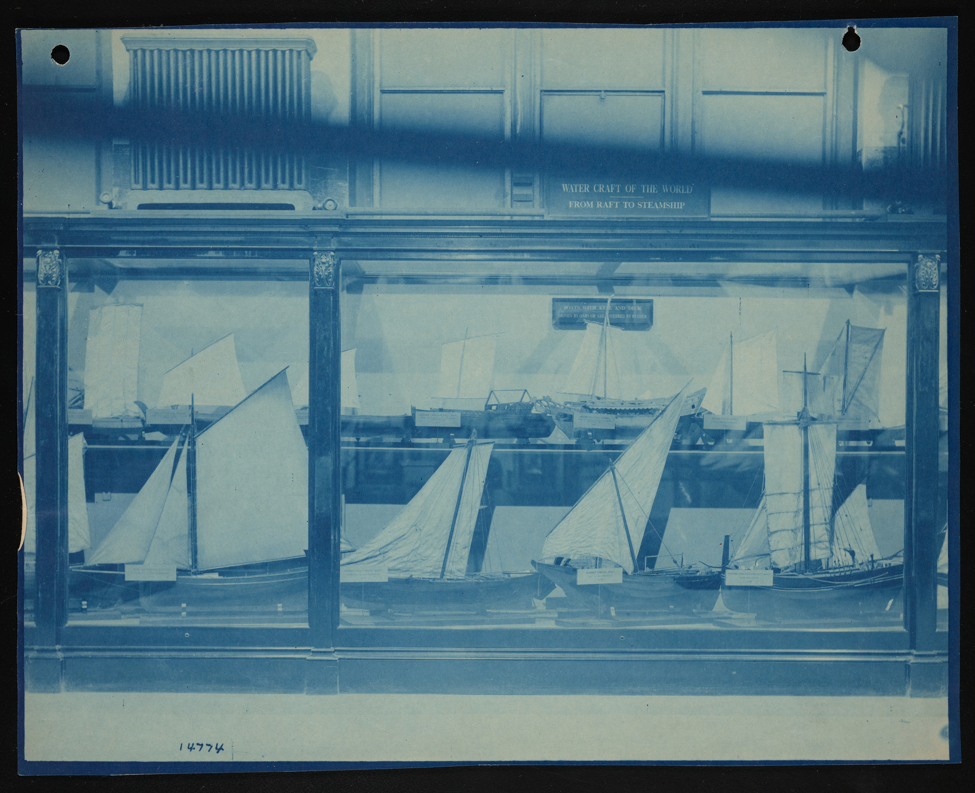 Interior view, water transportation exhibits in Boat Hall in the North East Range of the United States National Museum, now known as the Arts and Industries Building, featuring water craft of the world, boats, boat models, and ship models.
