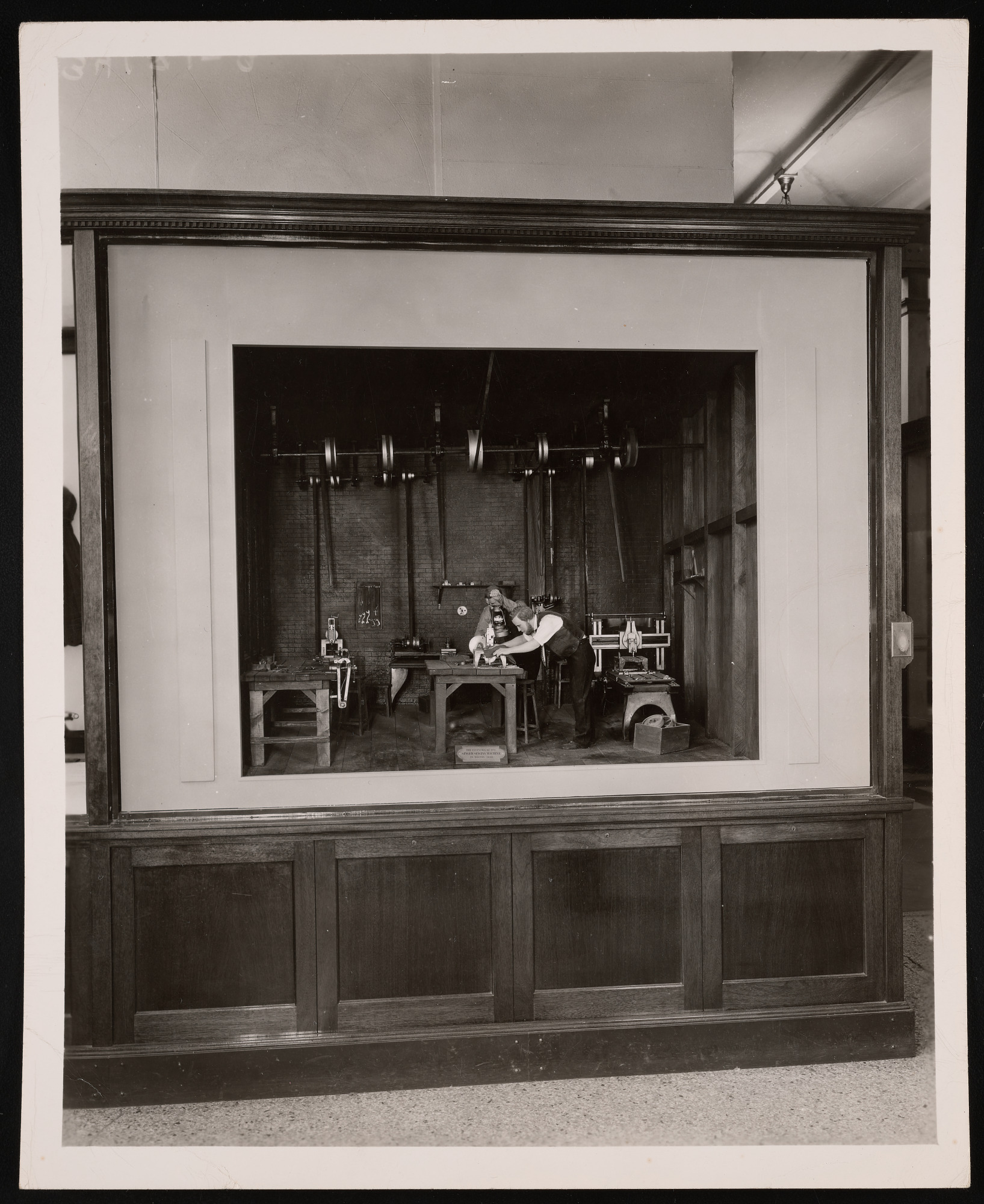 Museum of History and Technology preview of Hall of Textiles exhibits in the Arts and Industries Building, illustrating the history of the development of the sewing machine, with diorama showing the invention of the Singer sewing machine.