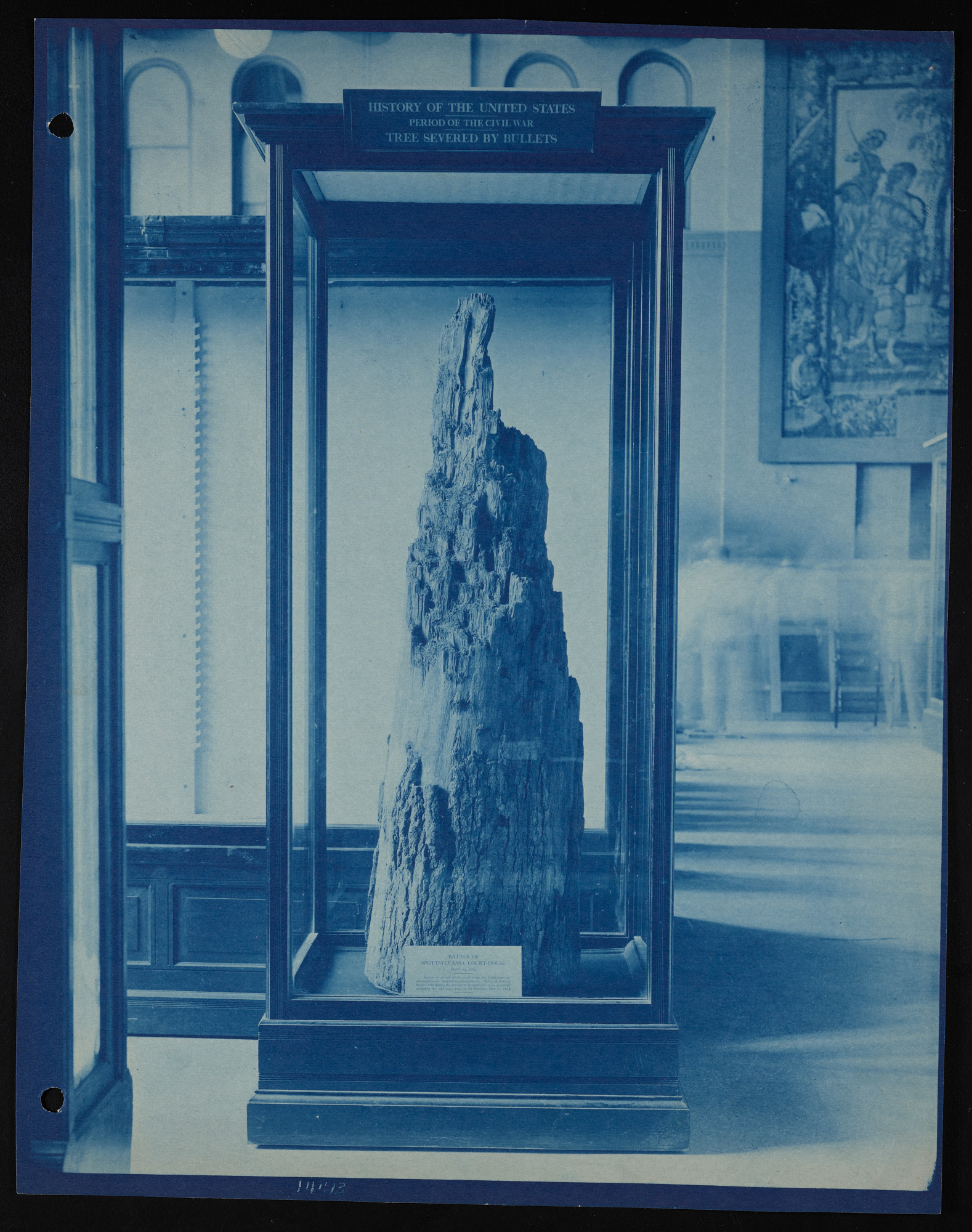 Interior view, "History of the United States" exhibits in the United States National Museum, now known as the Arts and Industries Building, featuring "Period of the Civil War, Tree Severed by Bullets" at the Battle of Spotsylvania Court House, May 12, 1864.