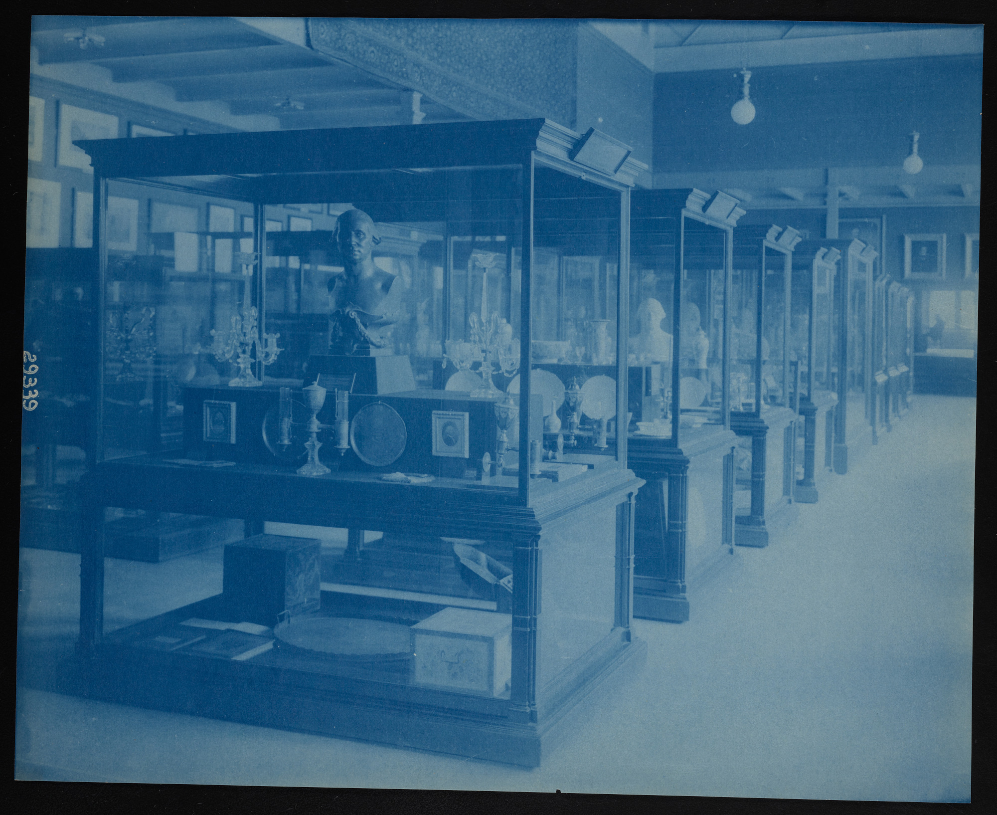 Interior view, "History of the United States" exhibits in the United States National Museum, now known as the Arts and Industries Building, featuring relics of George Washington.