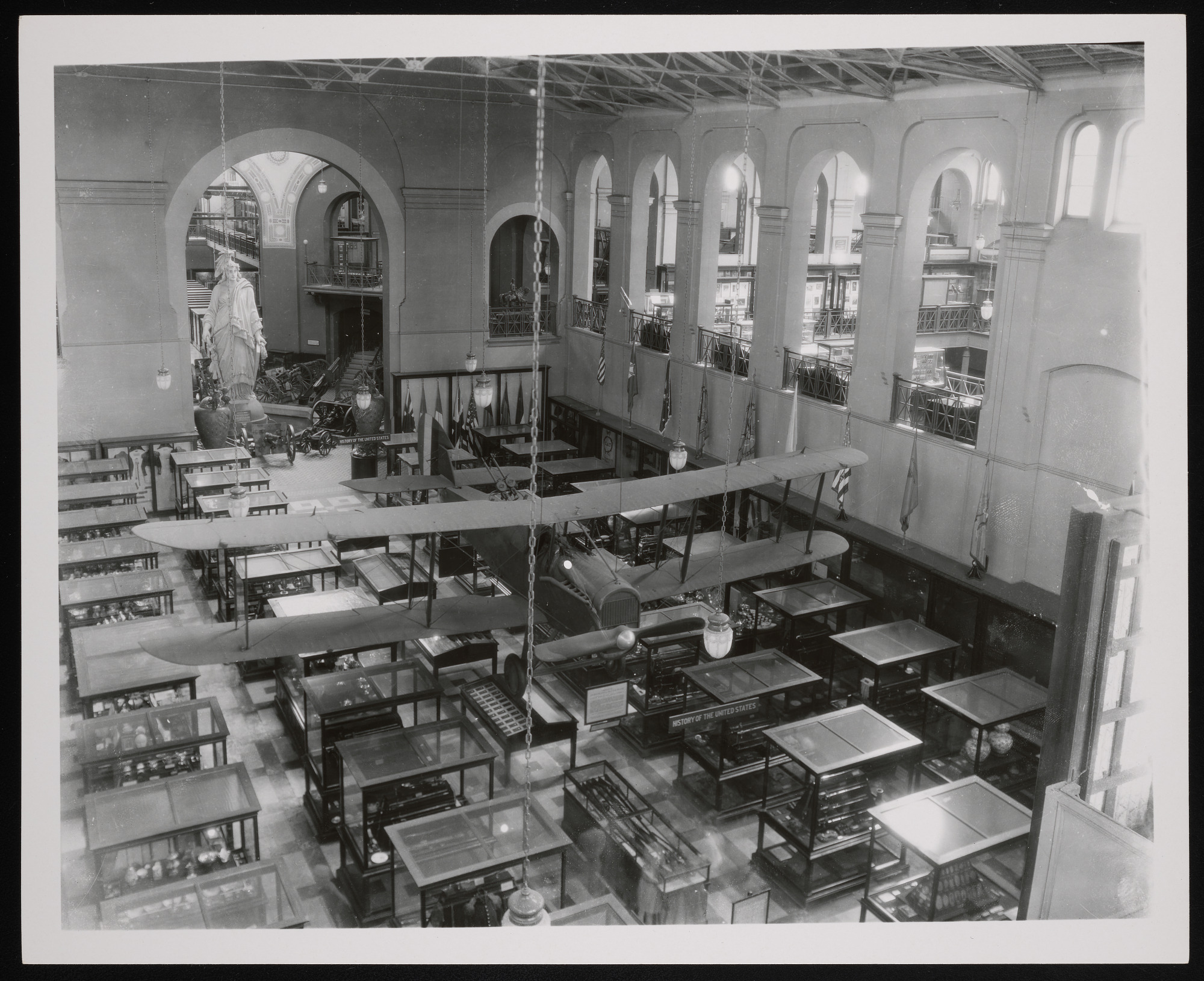 Interior view, "History of the United States" exhibits in the North Hall of the United States National Museum, now known as the Arts and Industries Building, with De Havilland DH-4 airplane in view.