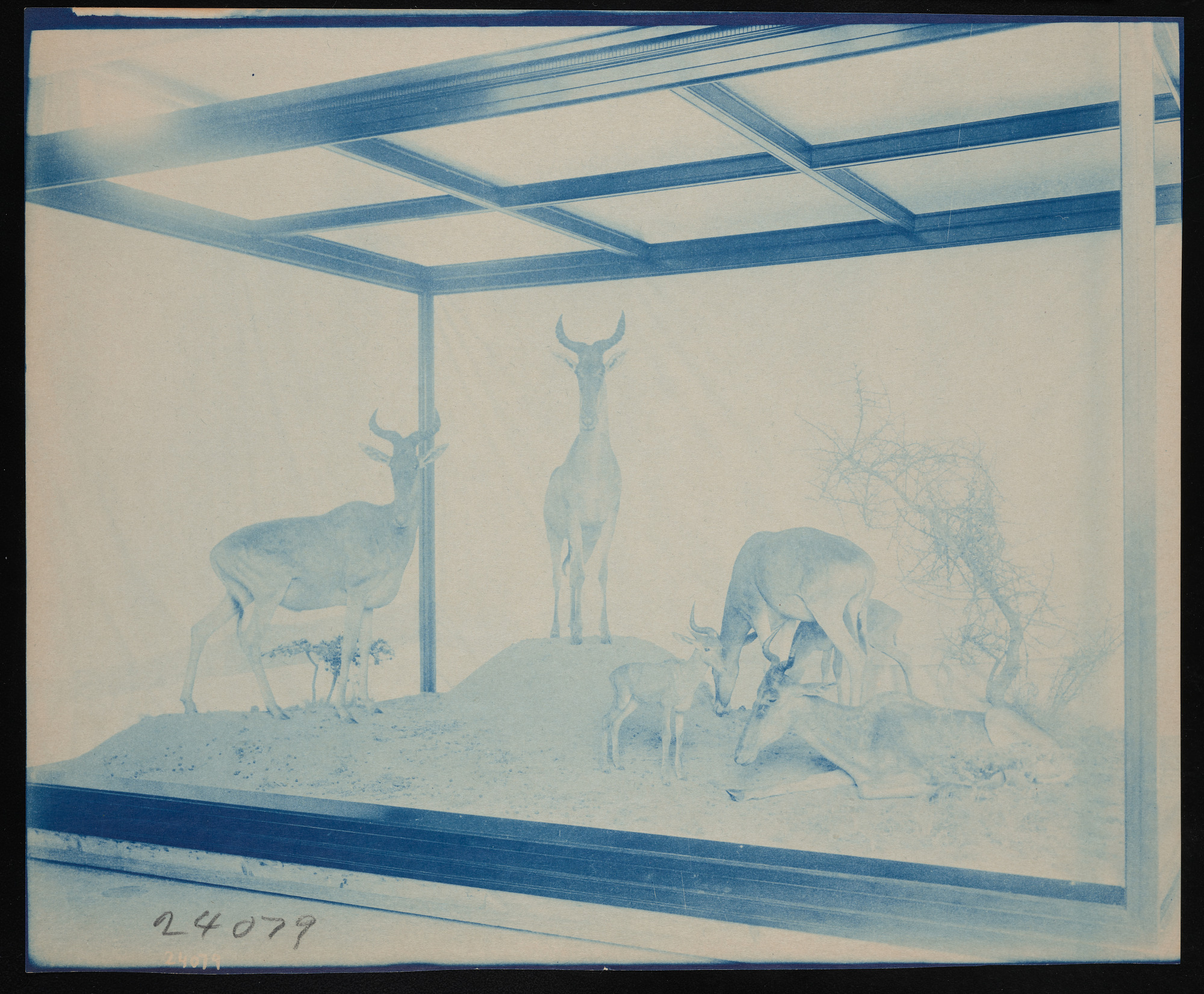 Interior view, United States National Museum African mammals exhibits in the Natural History Building, now known as the National Museum of Natural History, featuring Coke's hartebeest group, also known as kongoni.