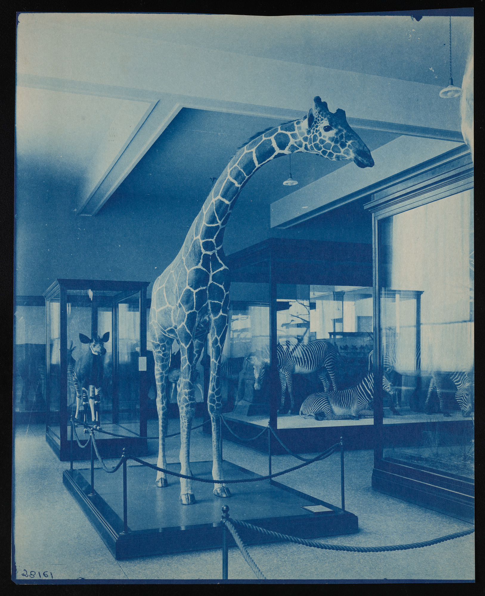 Interior view, United States National Museum African mammals exhibits in the Natural History Building, now known as the National Museum of Natural History, featuring mounted giraffe specimen, with okapi and zebra group also in view.