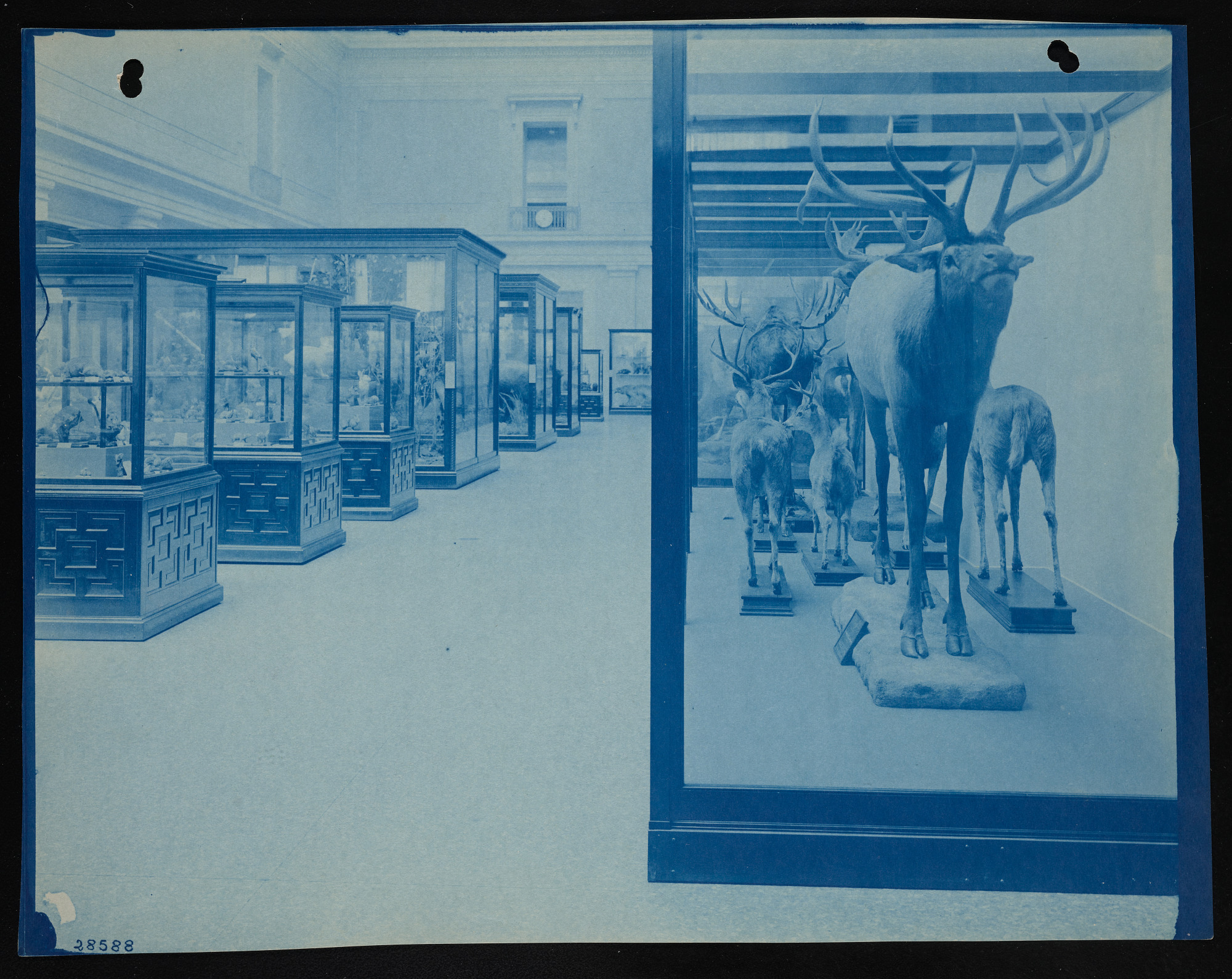 Interior view, United States National Museum North American mammals exhibits in the Natural History Building, now known as the National Museum of Natural History, featuring caribou group.
