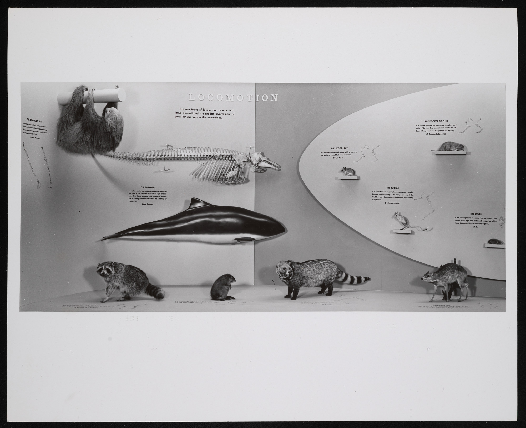 Exhibit case in World of Mammals exhibition hall at the Museum of Natural History, featuring "Locomotion."