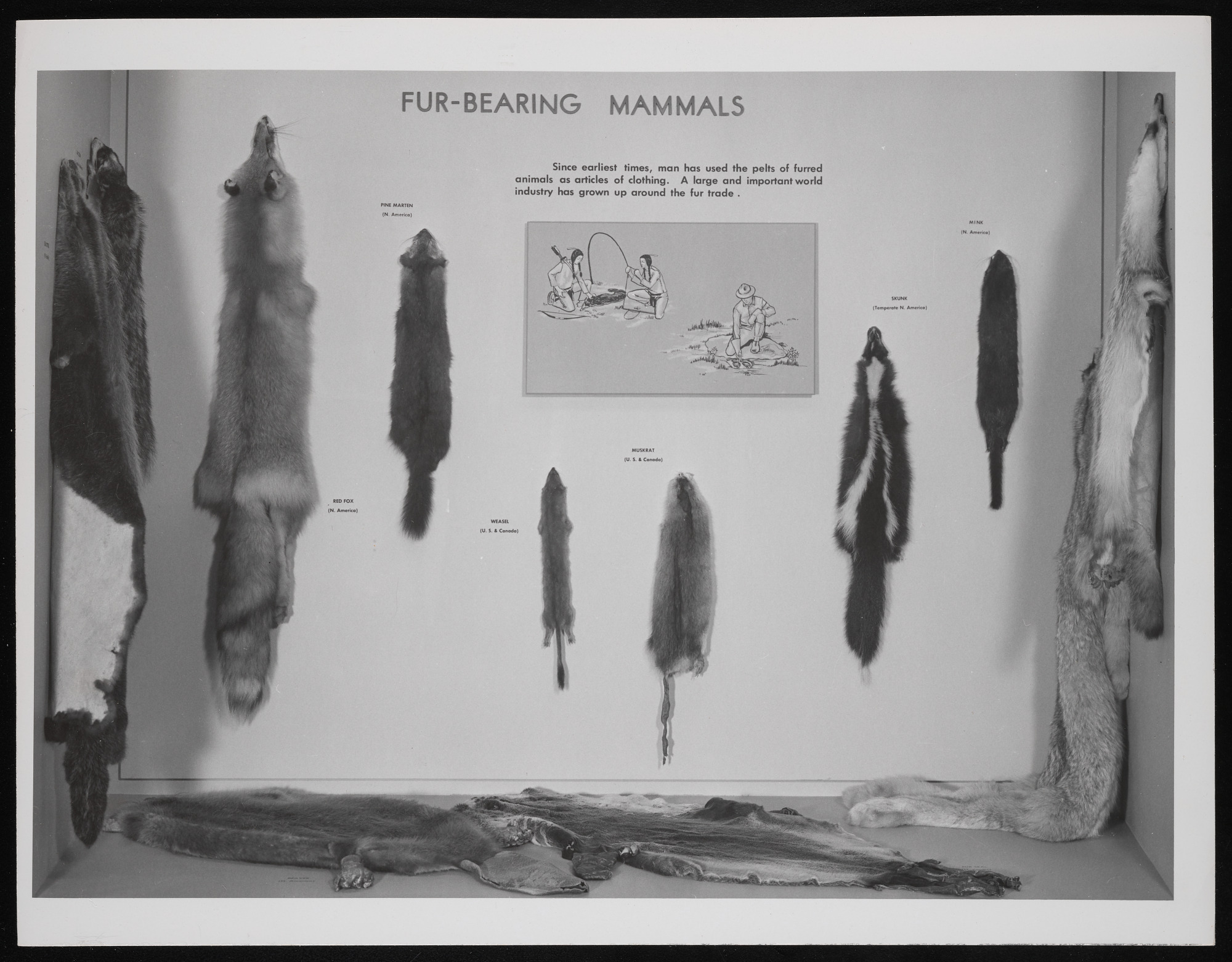 Exhibit case in World of Mammals exhibition hall at the Museum of Natural History, featuring "Fur-Bearing Mammals."