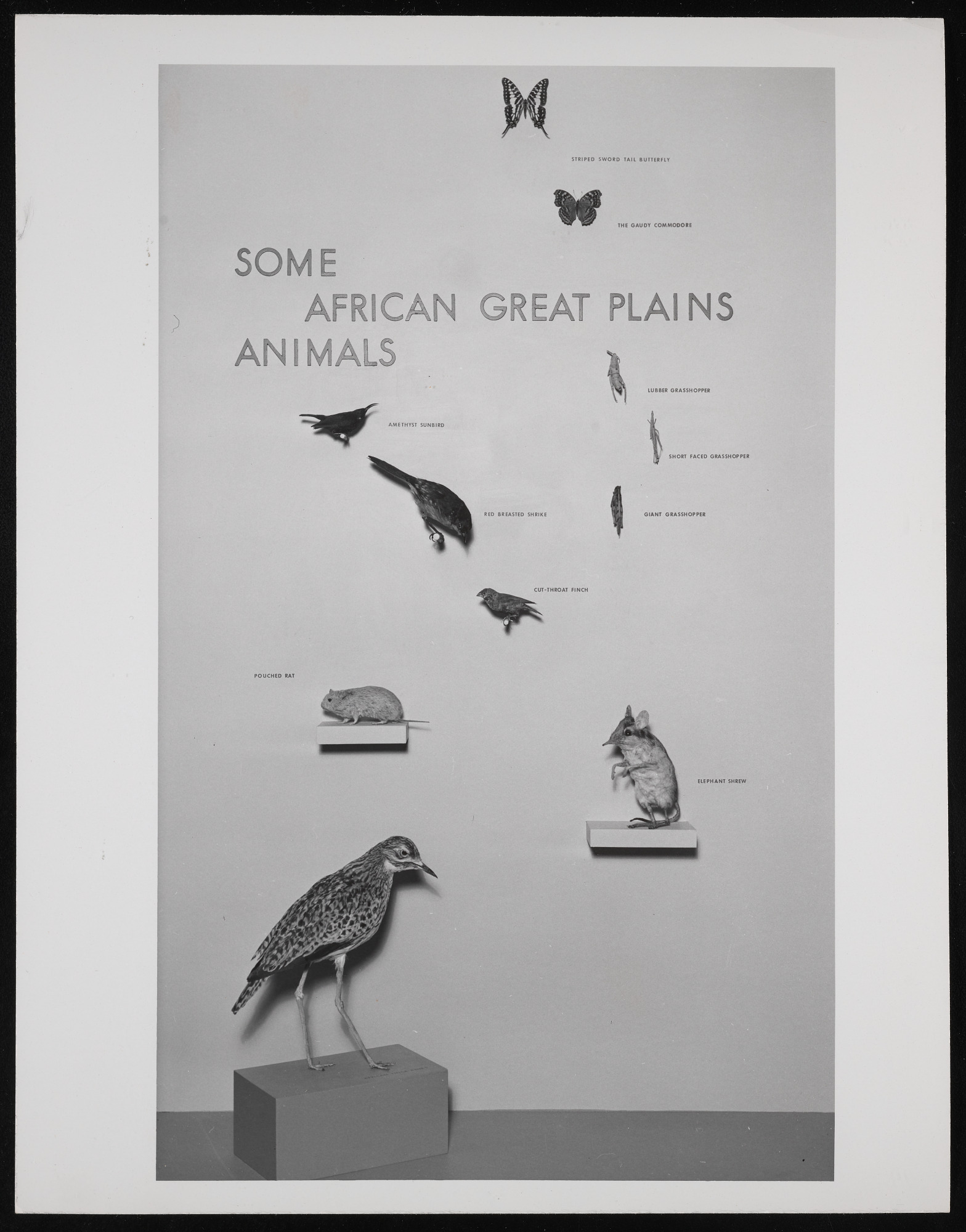 Exhibit case in World of Mammals exhibition hall at the Museum of Natural History, featuring "Some African Great Plains Animals."