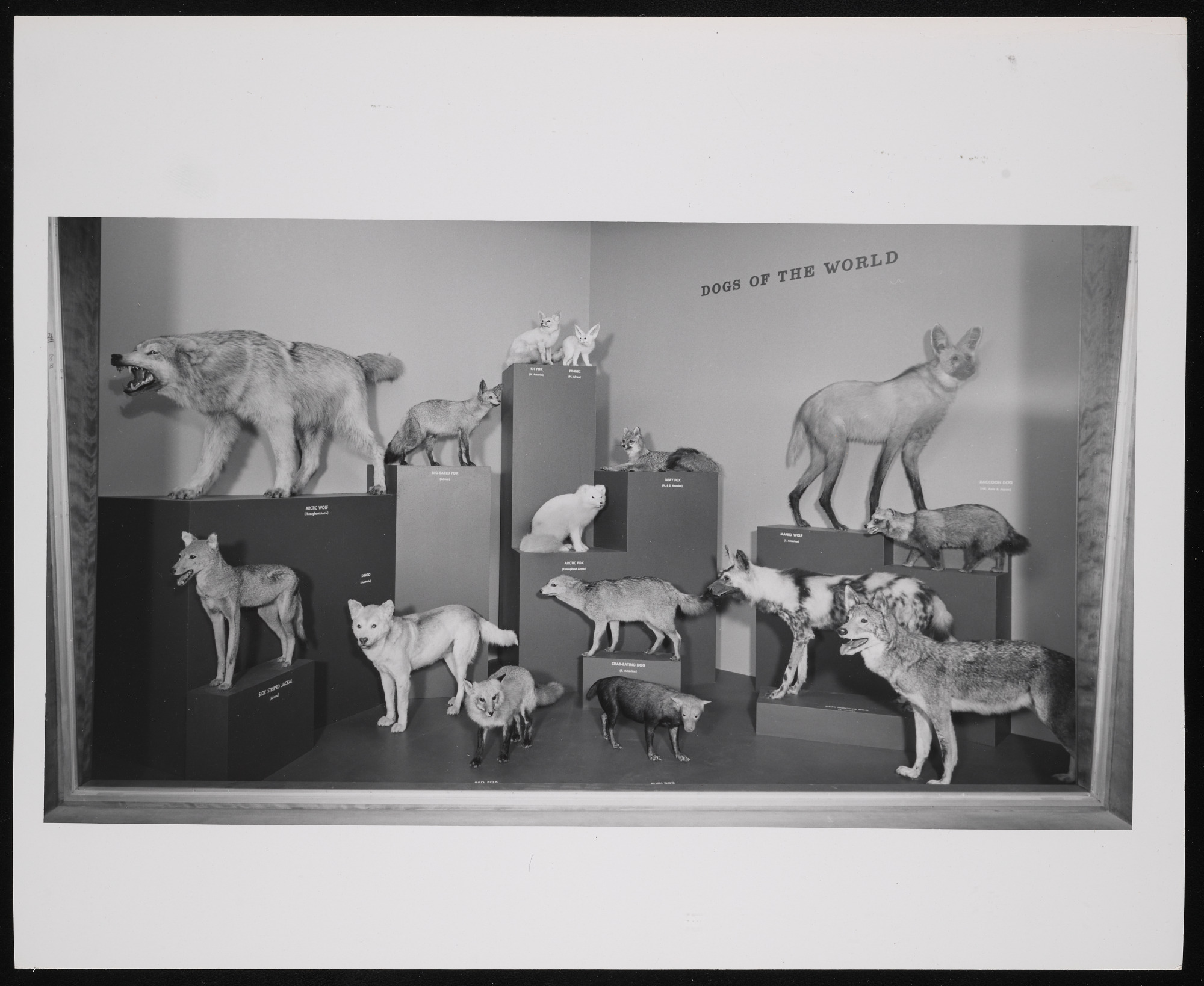 Exhibit case in World of Mammals exhibition hall at the Museum of Natural History, featuring "Dogs of the World."