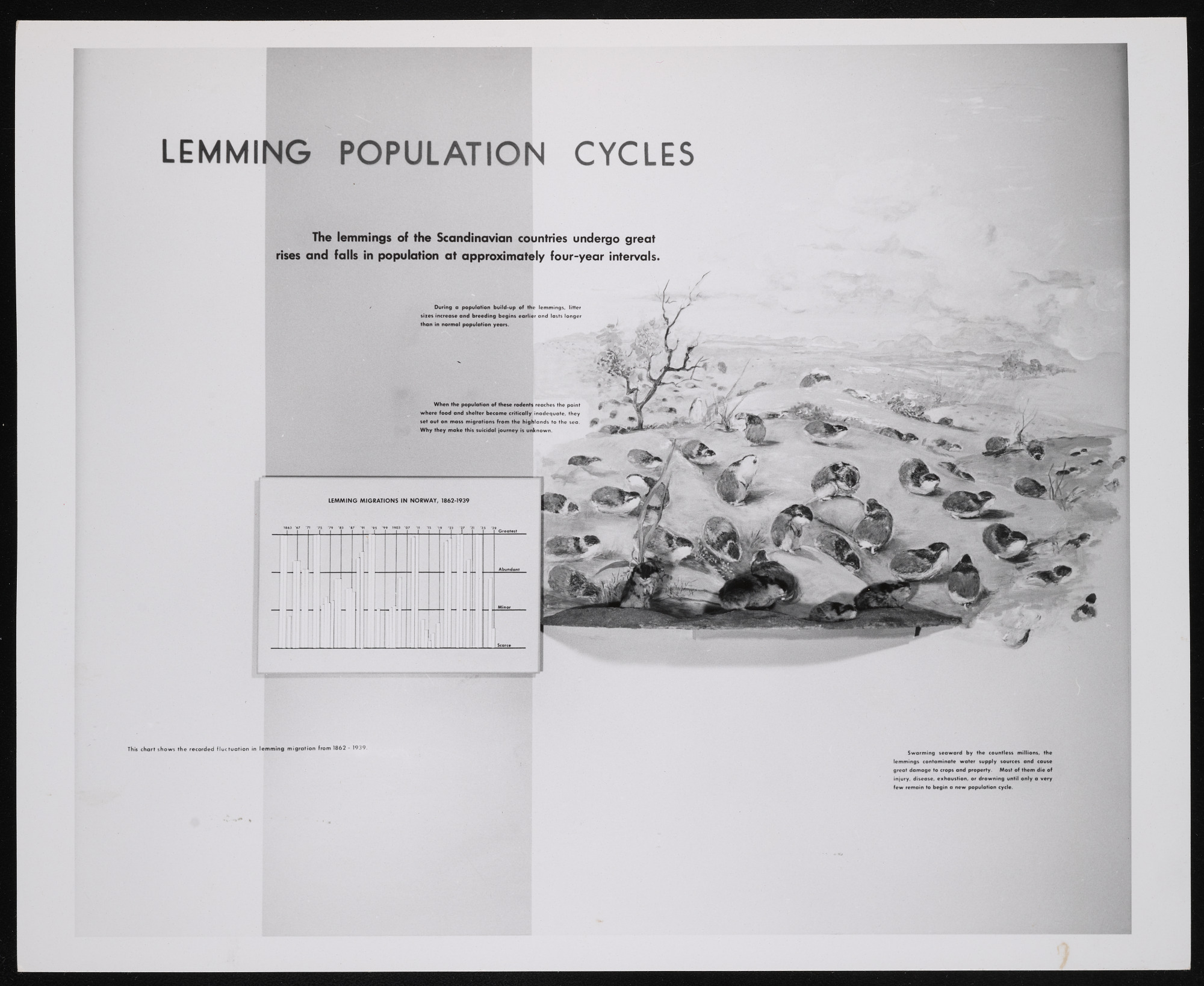 Exhibit case in World of Mammals exhibition hall at the Museum of Natural History, featuring "Lemming Population Cycles."