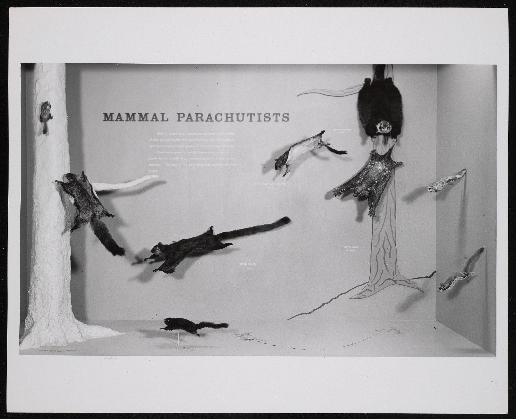 Exhibit case in World of Mammals exhibition hall at the Museum of Natural History, featuring "Mammal Parachutists."