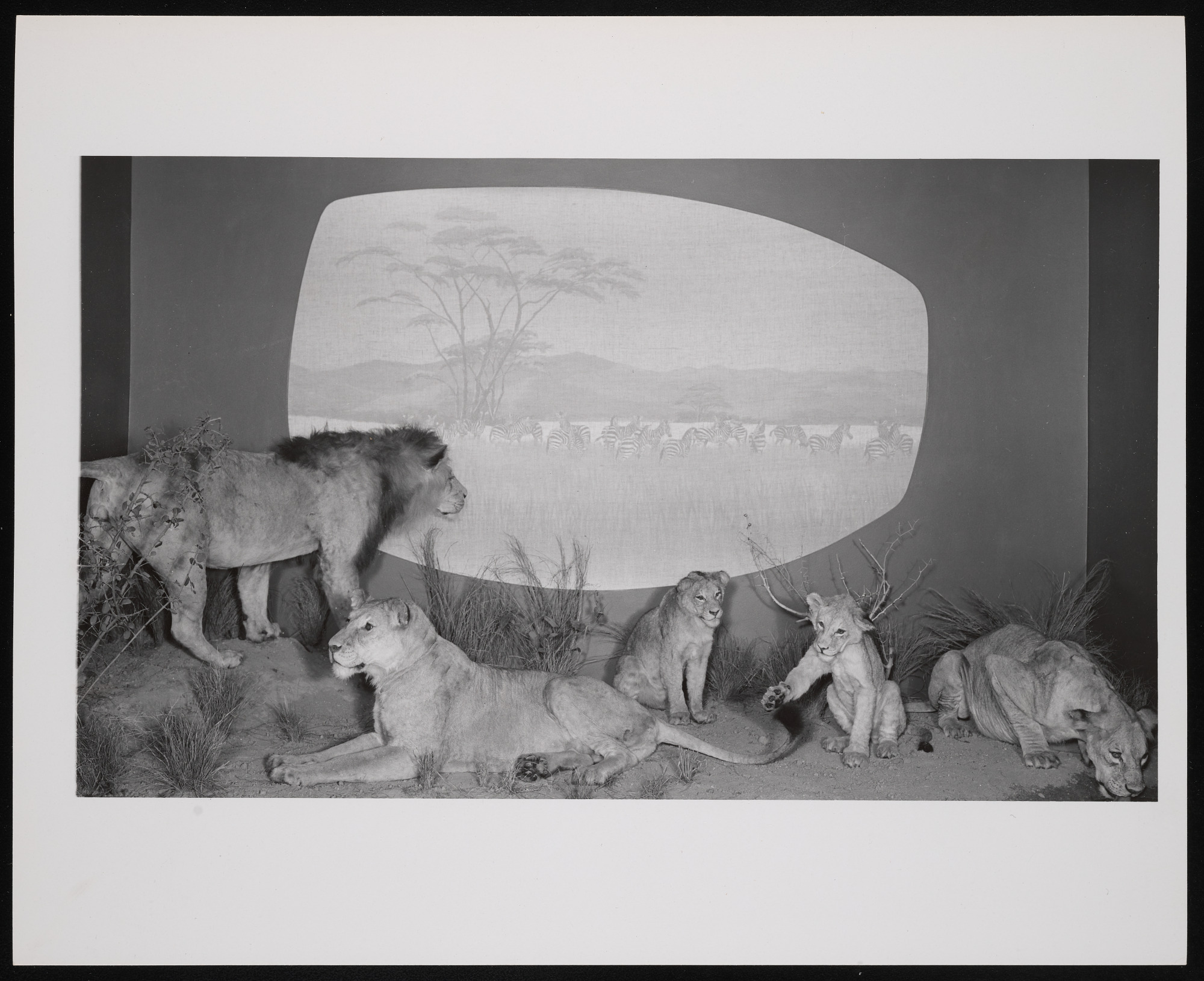 Exhibit case in World of Mammals exhibition hall at the Museum of Natural History, featuring lion habitat group.