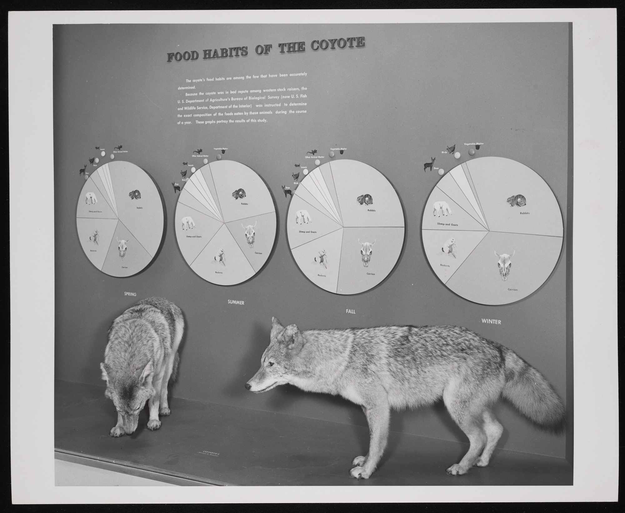 Exhibit case in World of Mammals exhibition hall at the Museum of Natural History, featuring "Food Habits of the Coyote."