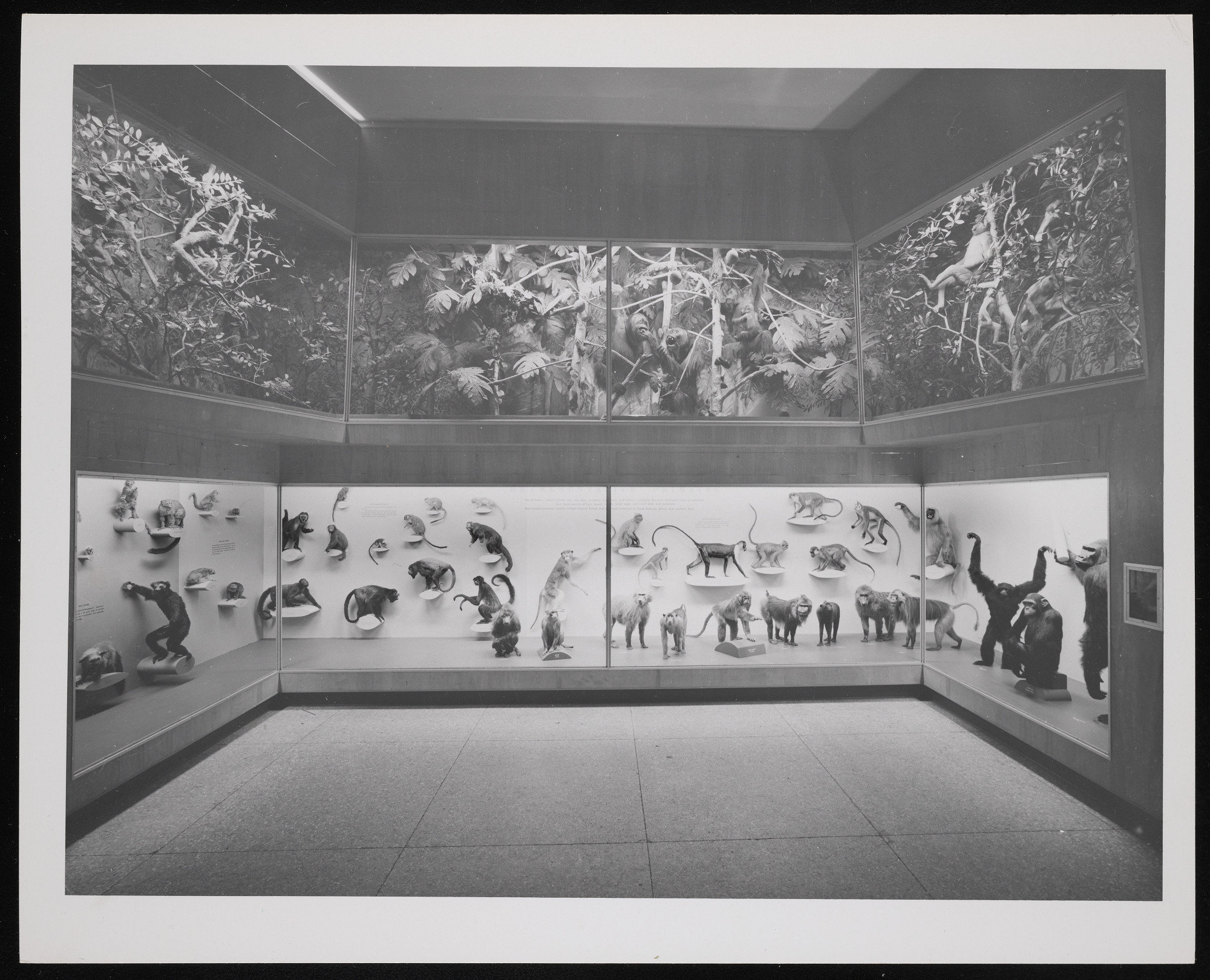 Interior view, World of Mammals exhibition hall at the Museum of Natural History, featuring monkeys.