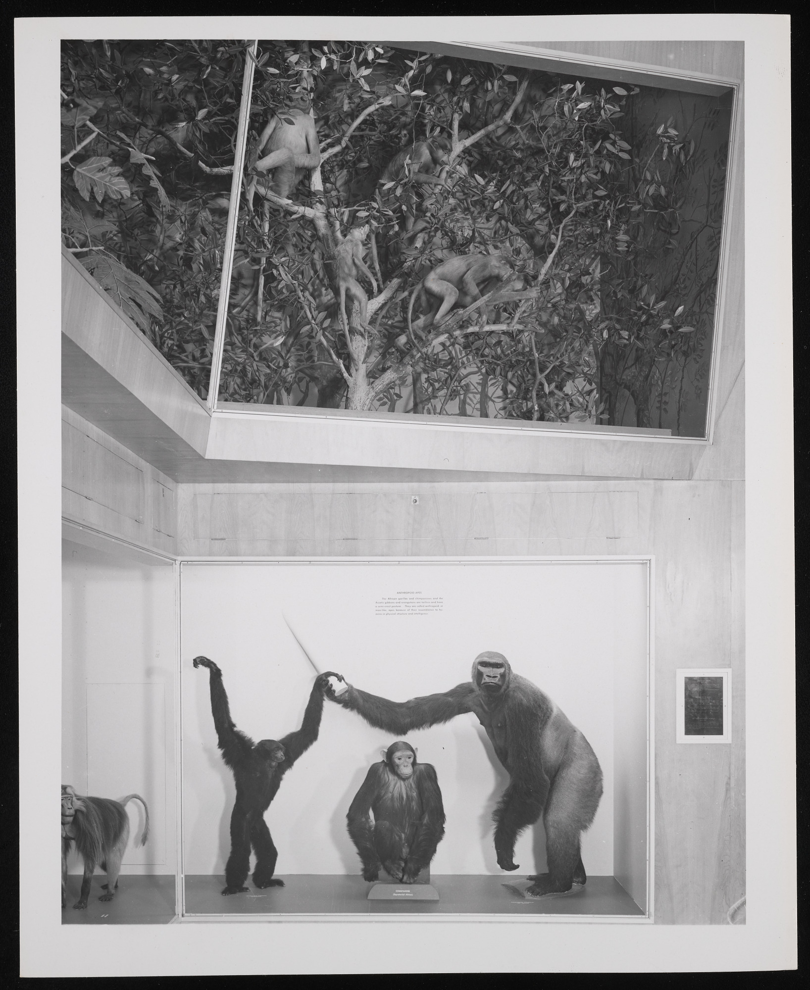 Interior view, World of Mammals exhibition hall at the Museum of Natural History, featuring monkeys.