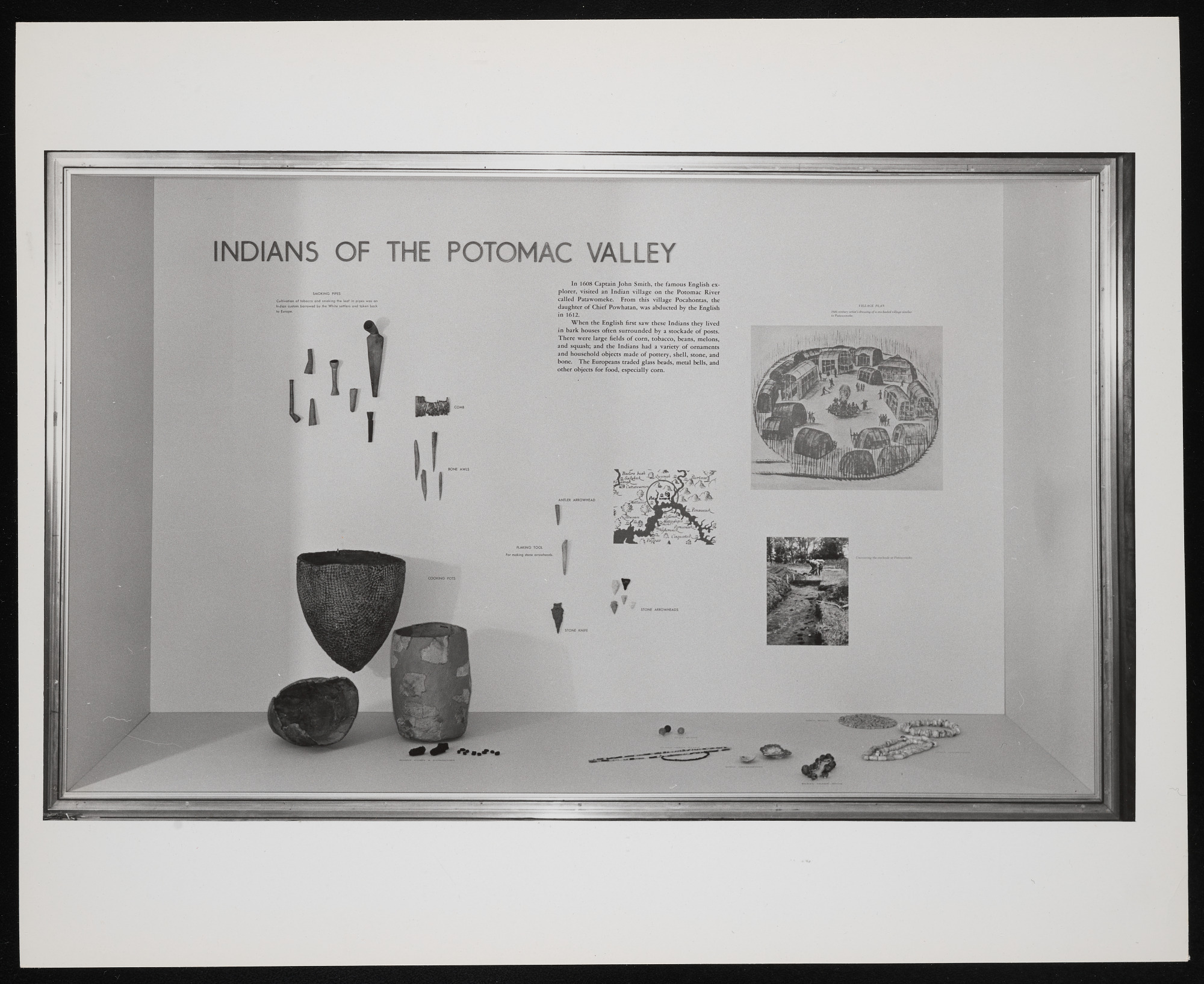Hall of North American Archeology exhibit case in Hall 22 at Museum of Natural History, featuring "Indians of the Potomac Valley."
