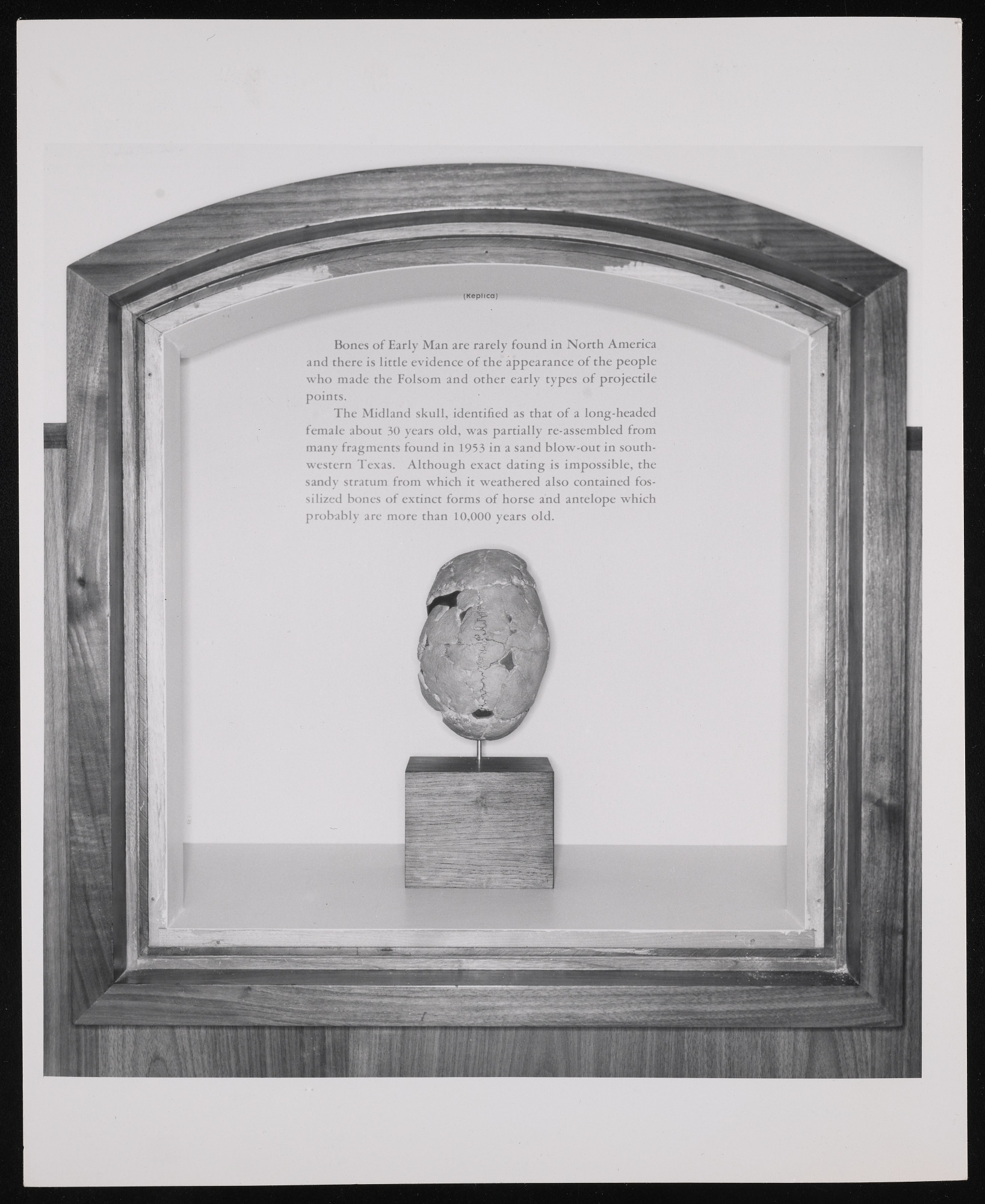 Hall of North American Archeology exhibit case in Hall 22 at Museum of Natural History, featuring replica of the "Midland Skull."