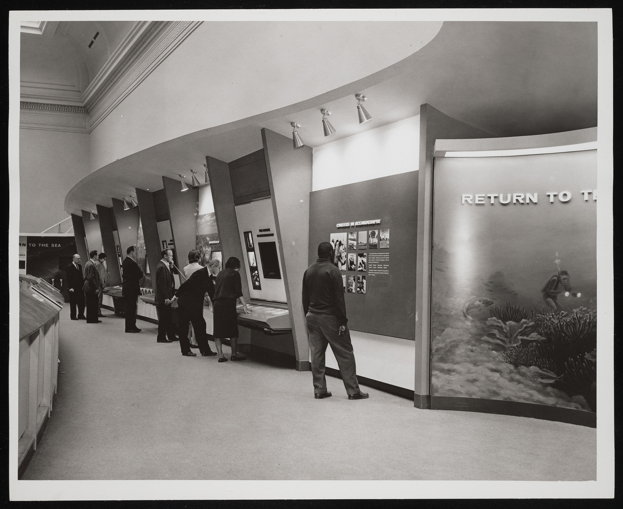 Interior view, "Return to the Sea" exhibition in the Hall of Life in the Sea at Museum of Natural History, sponsored by the Interagency Committee on Oceanography of the Federal Council for Science and Technology, with museum visitors.