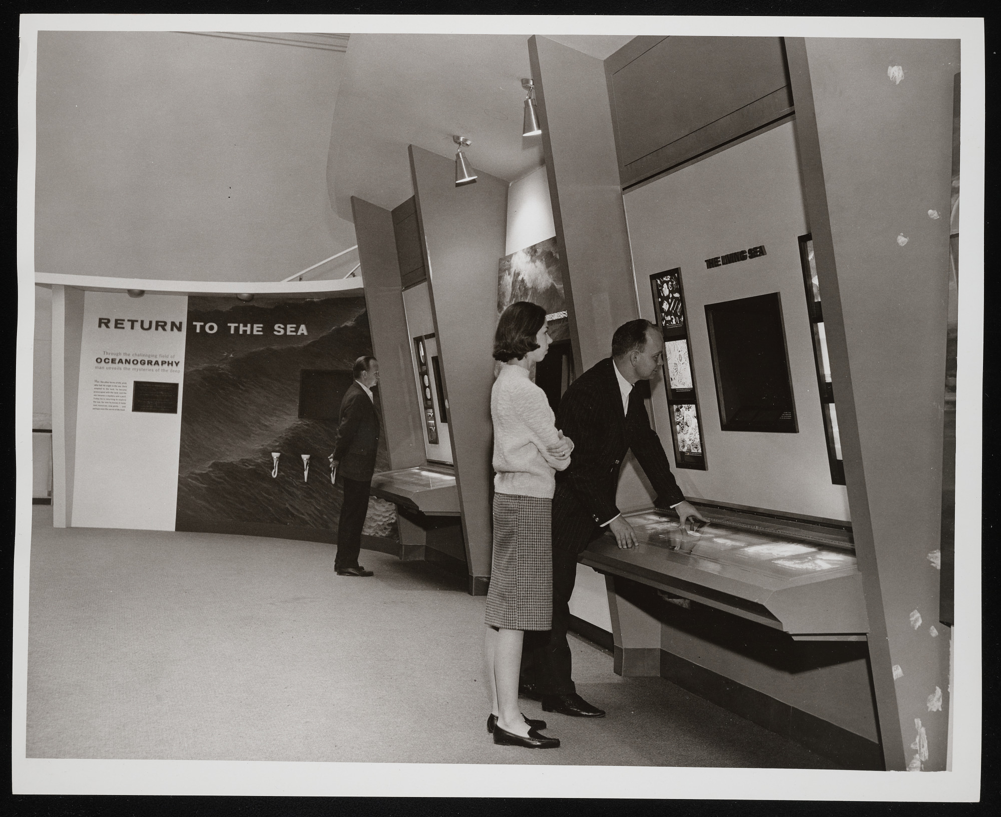 Interior view, "Return to the Sea" exhibition in the Hall of Life in the Sea at Museum of Natural History, sponsored by the Interagency Committee on Oceanography of the Federal Council for Science and Technology, with museum visitors.
