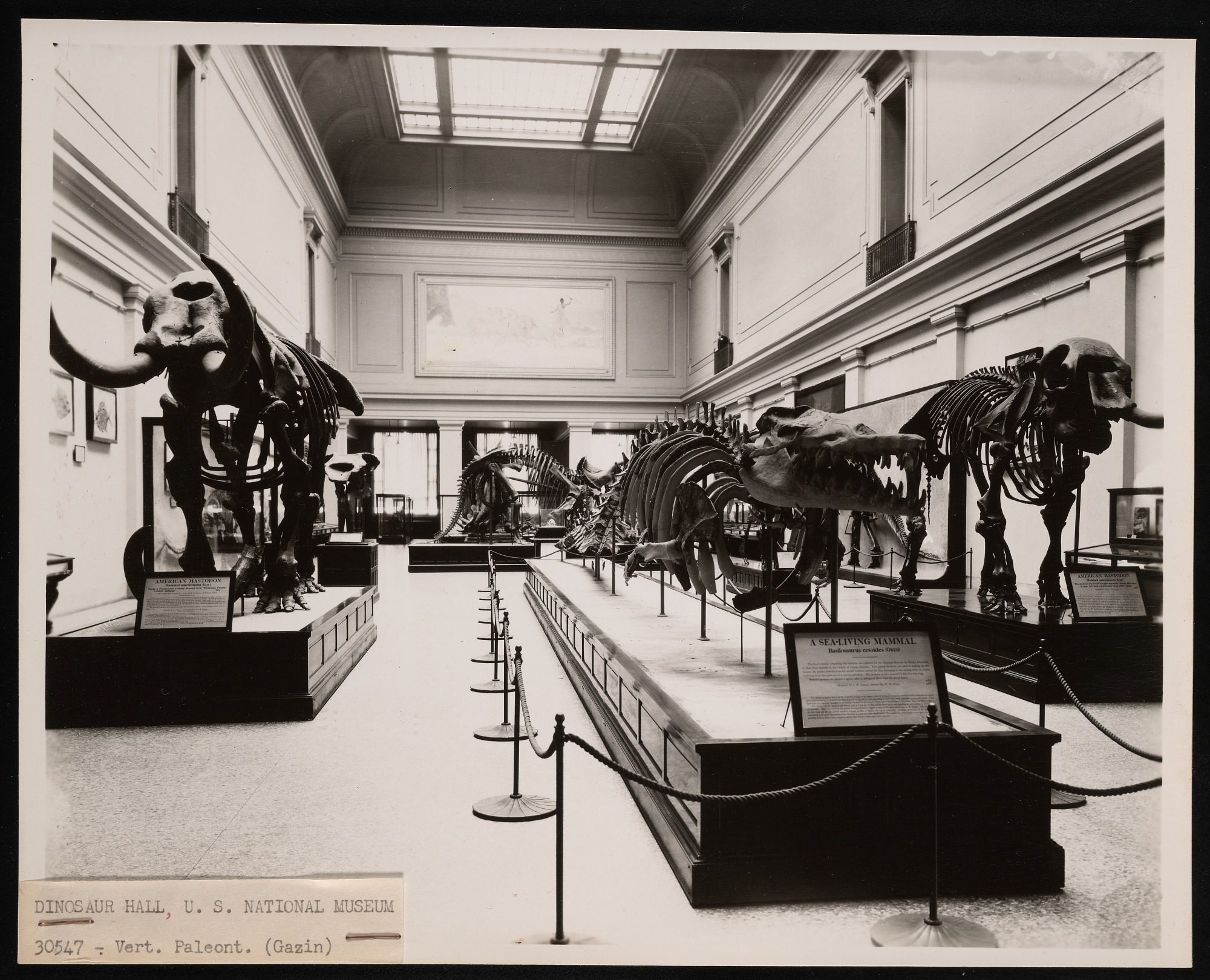 Interior view, United States National Museum paleontology exhibits in the Natural History Building, now known as National Museum of Natural History, with skeletons of mastodons, Basilosaurus, and Triceratops in view.
