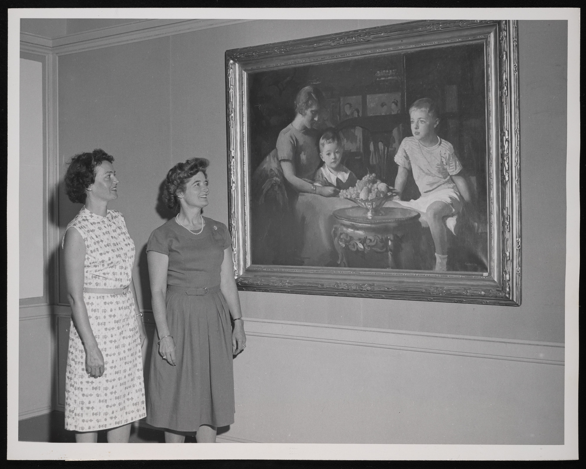 Interior view, National Collection of Fine Arts special exhibition in the Natural History Building, now known as National Museum of Natural History, featuring paintings by Edmund C. Tarbell, with "Margery, Edmund and Daniel," oil on canvas, 1935, in view, and the granddaughters of Tarbell, Mary Josephine Ferrell Cannon and Mercie Tarbell Clay Hoes, in attendance.