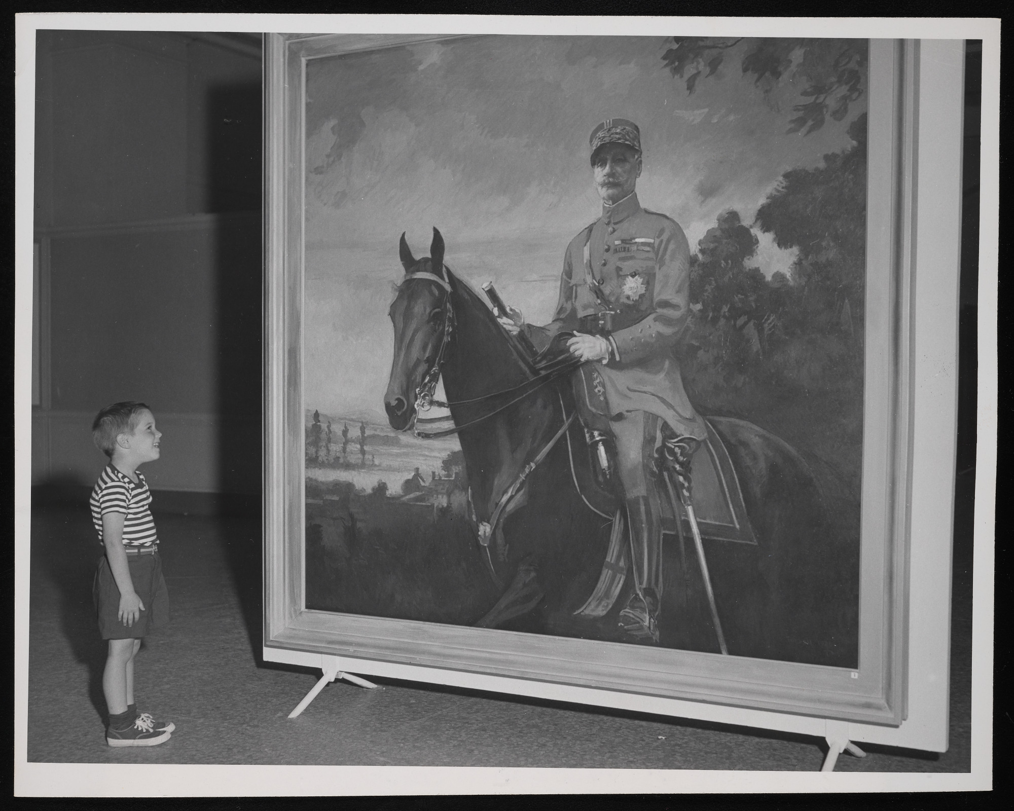 Interior view, National Collection of Fine Arts special exhibition in the Natural History Building, now known as National Museum of Natural History, featuring paintings by Edmund C. Tarbell, with "Marshal Ferdinand Foch," oil on canvas, 1920, in view, and the great grandson of Tarbell, Clay L. Hoes, in attendance.