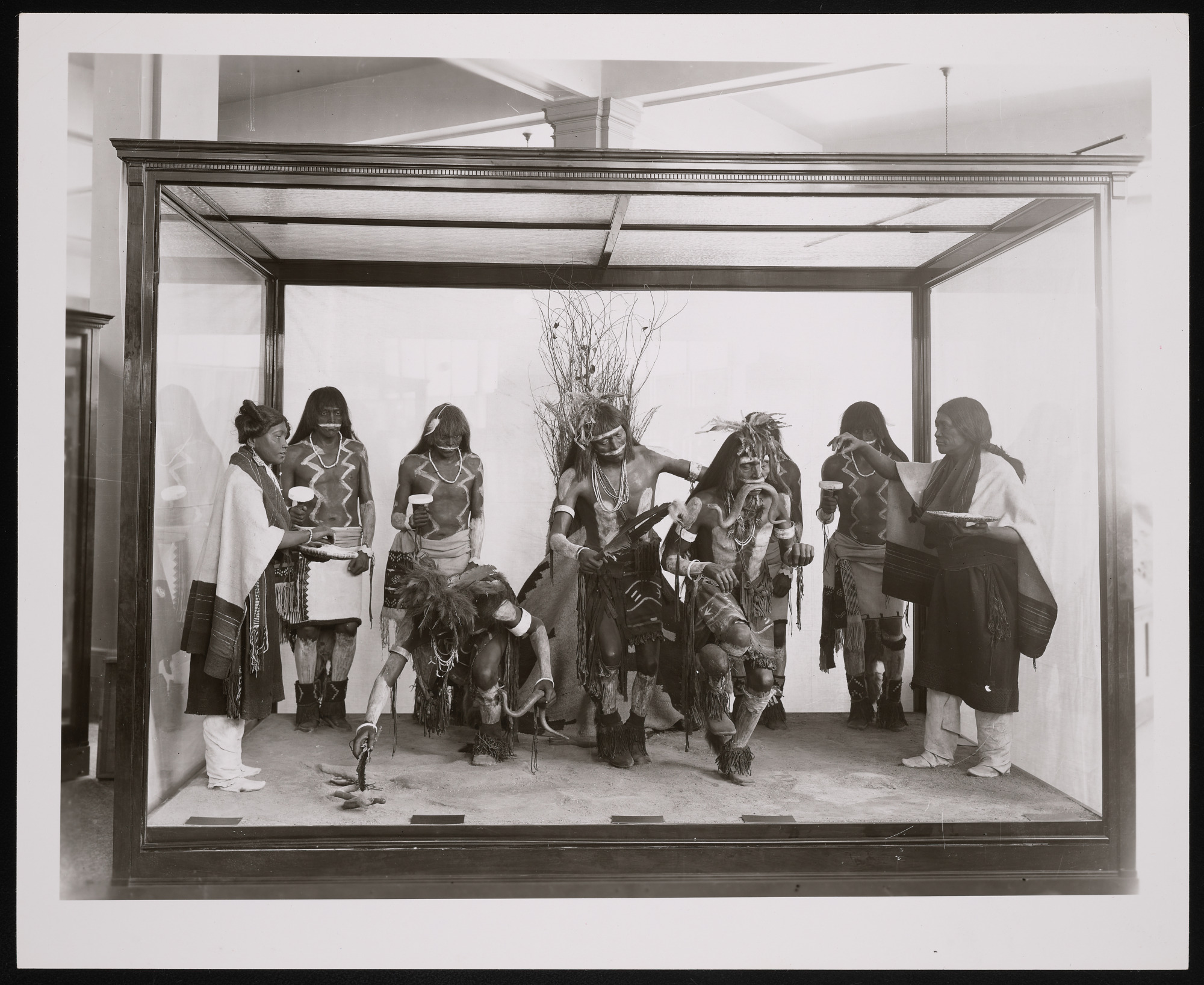 United States National Museum ethnology exhibit case in the Natural History Building, now known as the National Museum of Natural History, featuring figures performing the Snake Dance of the Hopi Indians of Arizona.