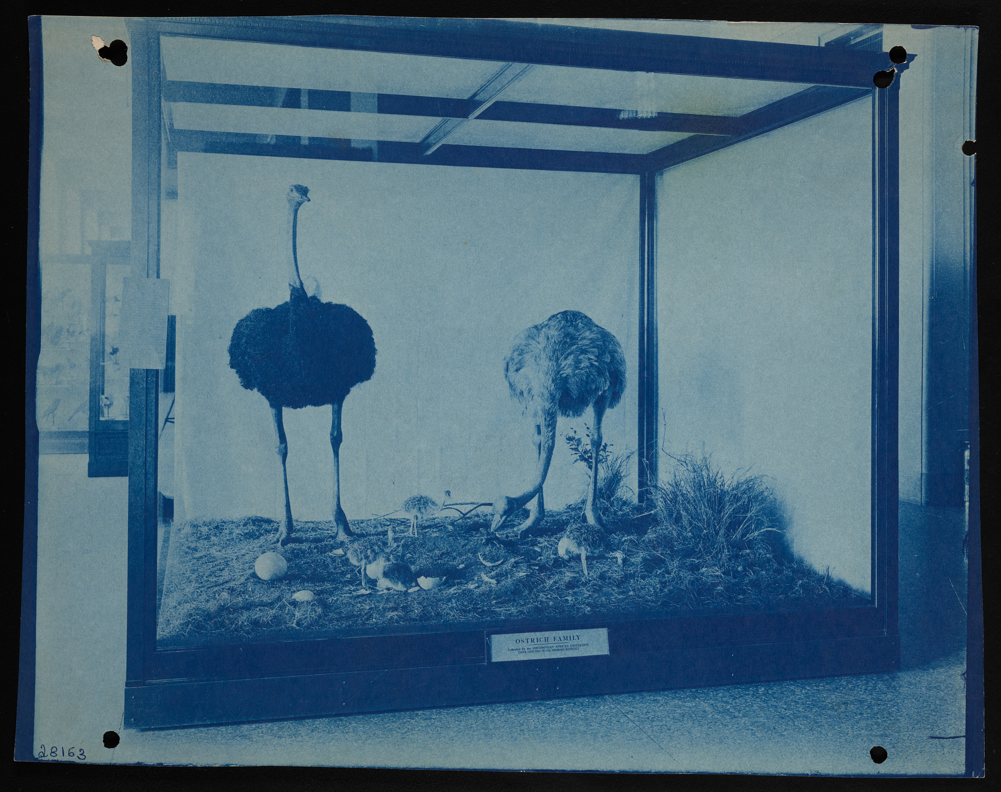 Interior view, United States National Museum birds exhibit case in the Natural History Building, now known as the National Museum of Natural History, featuring "Ostrich Family" collected during the Smithsonian-Roosevelt African Expedition in 1909.