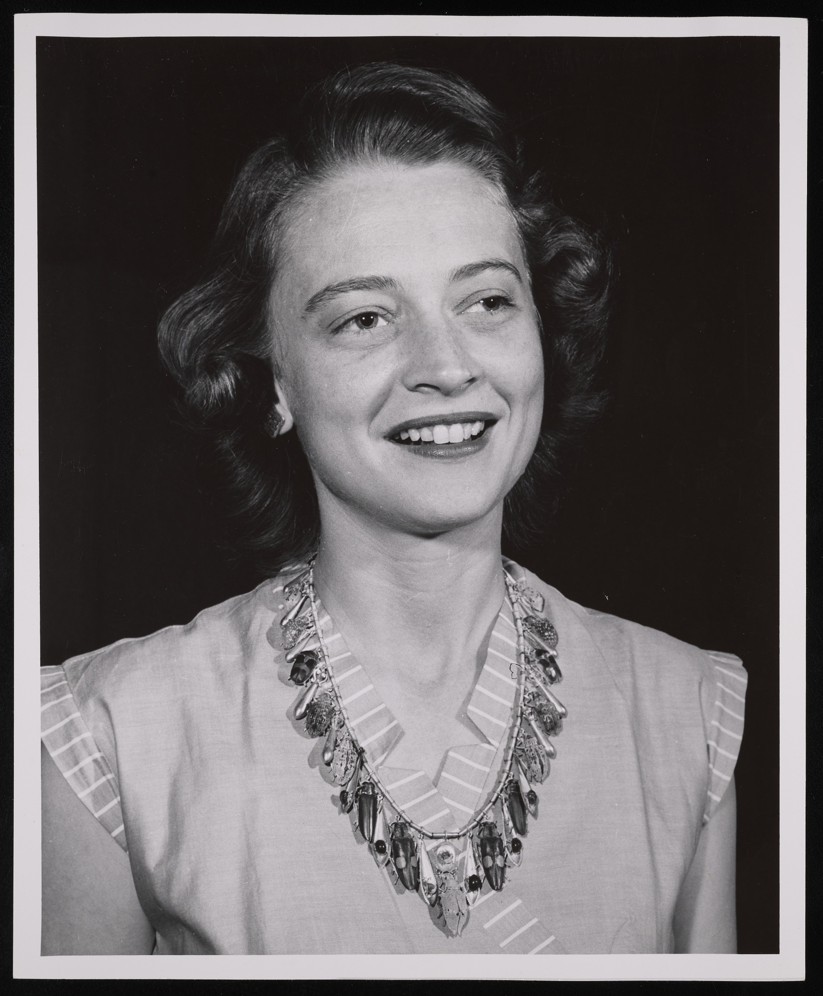 Portrait of Virginia Beets, secretary in the Division of Insects, wearing a necklace of Brazilian beetles set in gold, part of United States National Museum entomology exhibits in the Natural History Building, now known as the National Museum of Natural History.