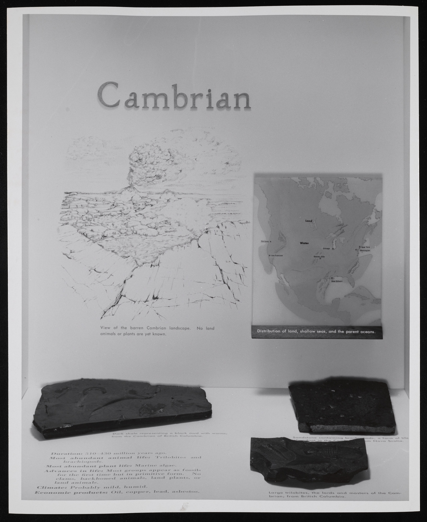 Hall of Fossil Plants and Invertebrate Animals exhibit case in the Museum of Natural History, featuring Cambrian fossils.
