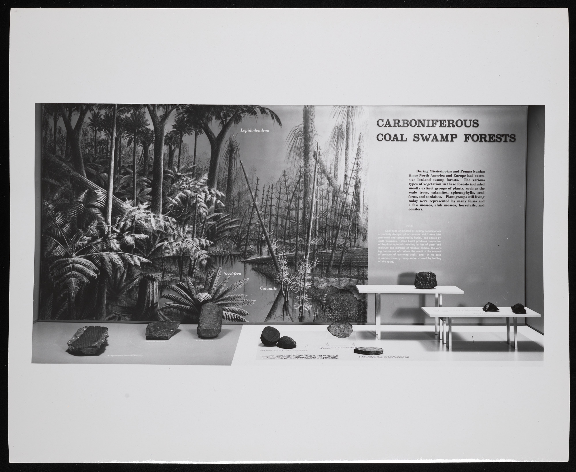 Hall of Fossil Plants and Invertebrate Animals exhibit case in the Museum of Natural History, featuring "Carboniferous Coal Swamp Forests."