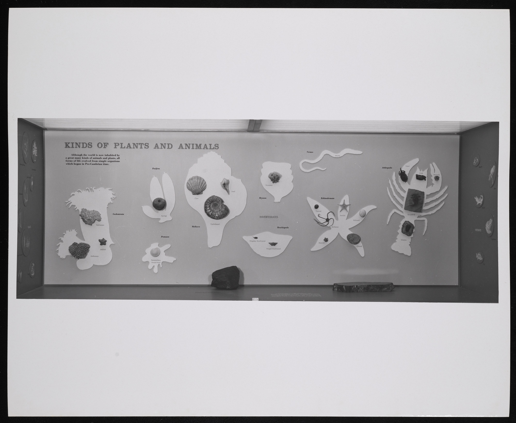 Hall of Fossil Plants and Invertebrate Animals exhibit case in the Museum of Natural History, featuring "Kinds of Plants and Animals" which illustrates pre-Cambrian simple organisms.