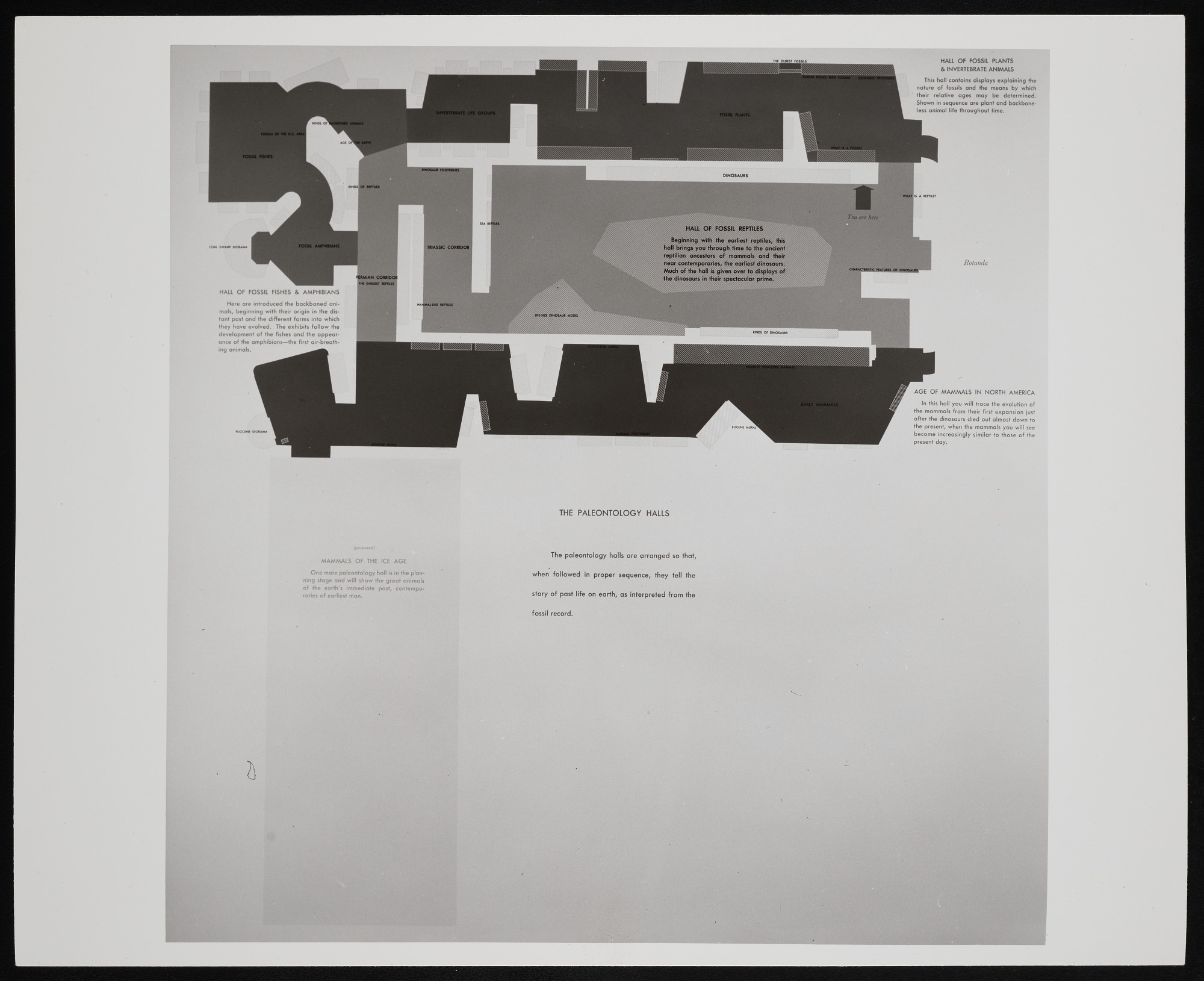 Floor plan of the Paleontology Halls at Museum of Natural History, including Hall of Dinosaurs and Fossil Reptiles, Hall of Fossil Plants and Invertebrate Animals, Hall of Fossil Fishes and Amphibians, and Age of Mammals in North America, and the proposed Mammals of the Ice Age.
