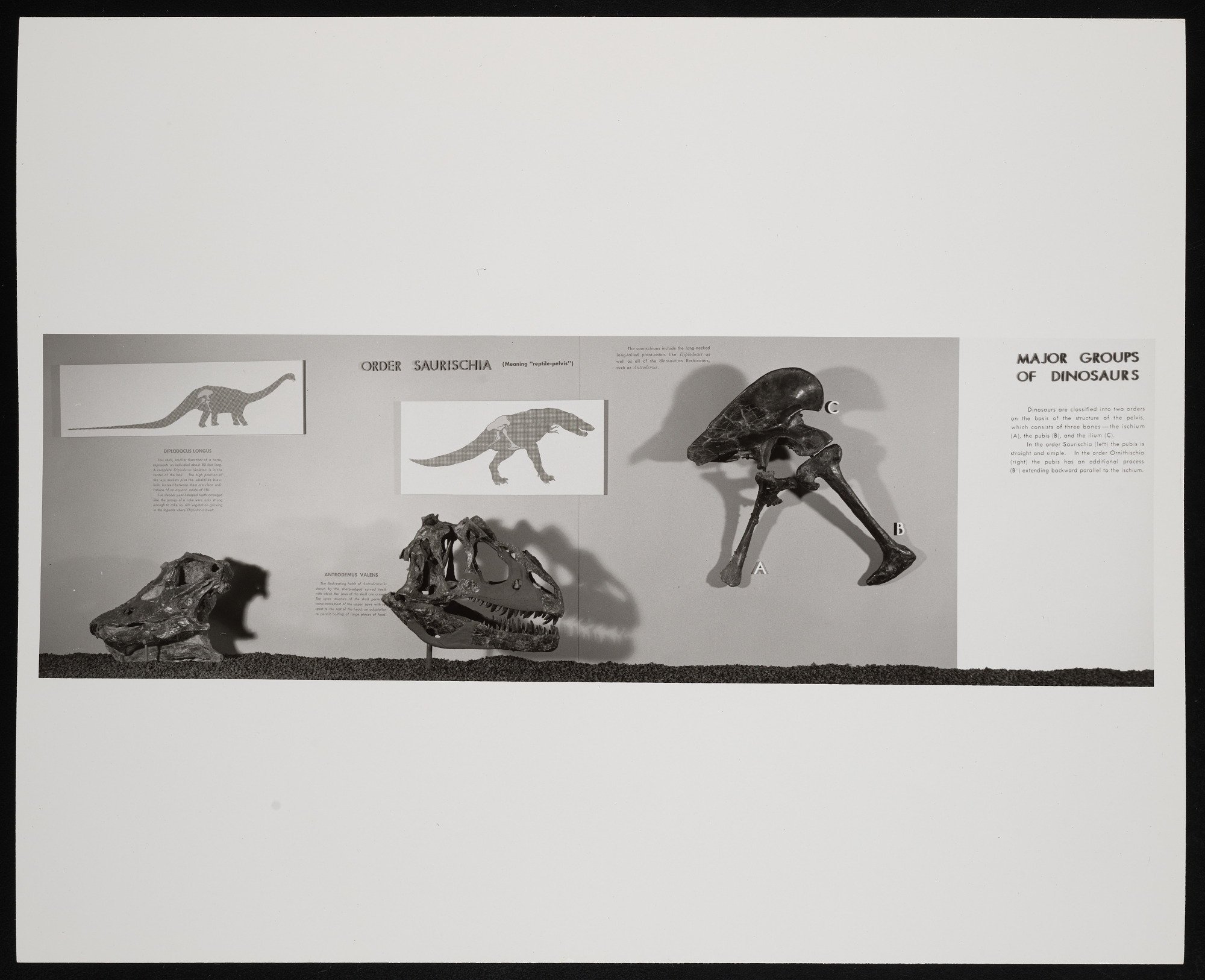Hall of Dinosaurs and Fossil Reptiles exhibit case in the Museum of Natural History, featuring "Major Groups of Dinosaurs: Order Saurischia."