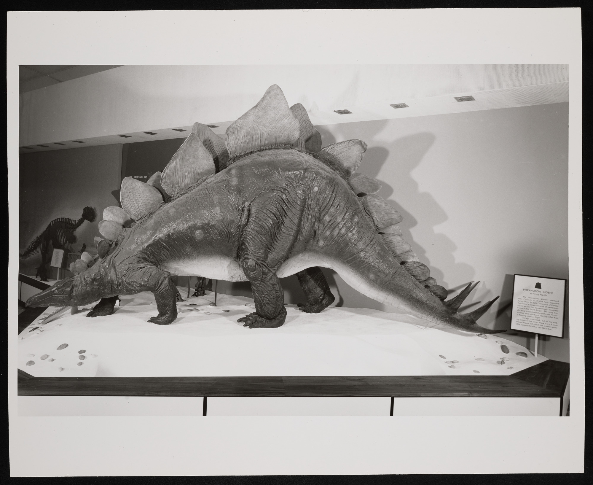 Hall of Dinosaurs and Fossil Reptiles exhibit in the Museum of Natural History, featuring papier-mache model of Stegosaurus stenops.